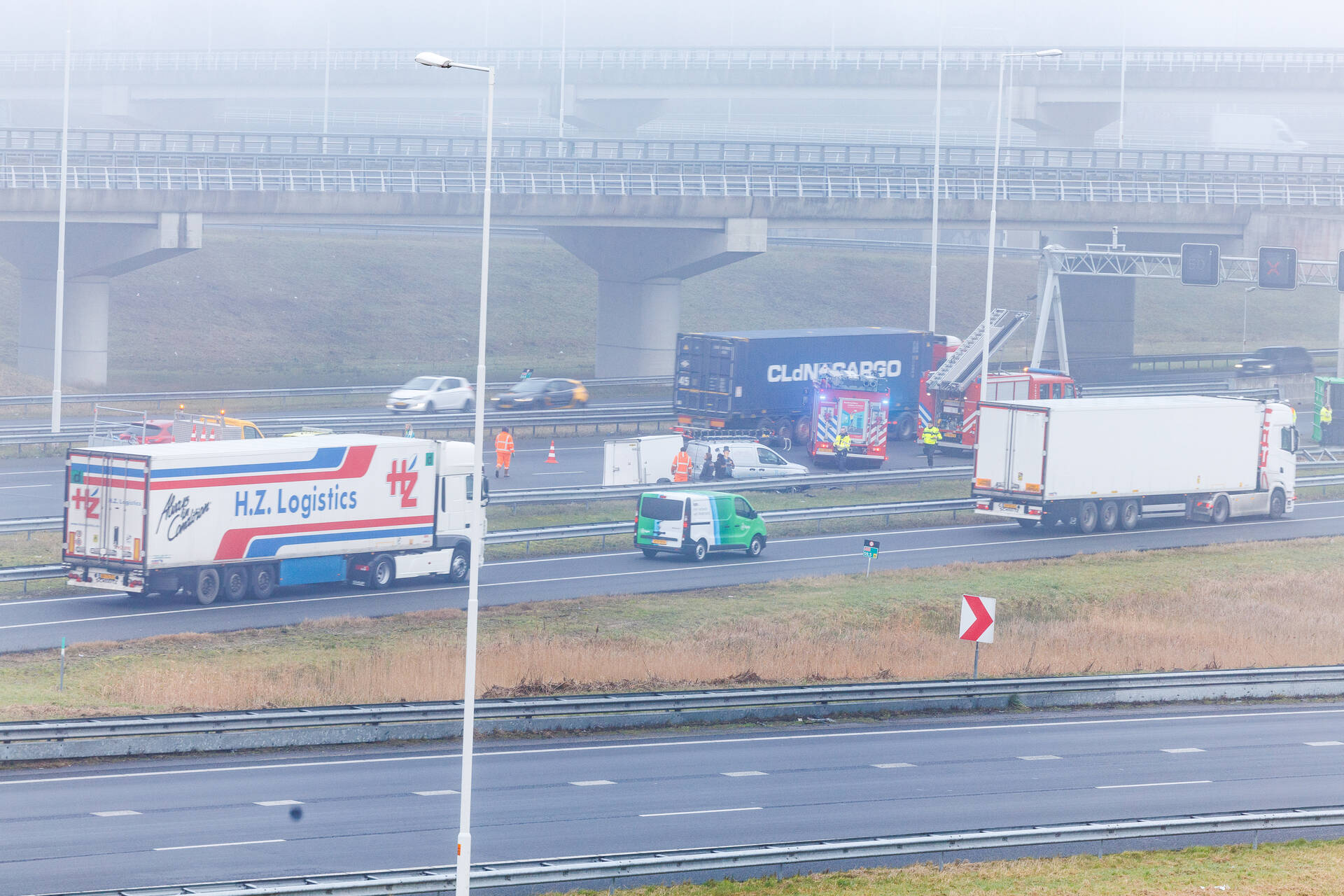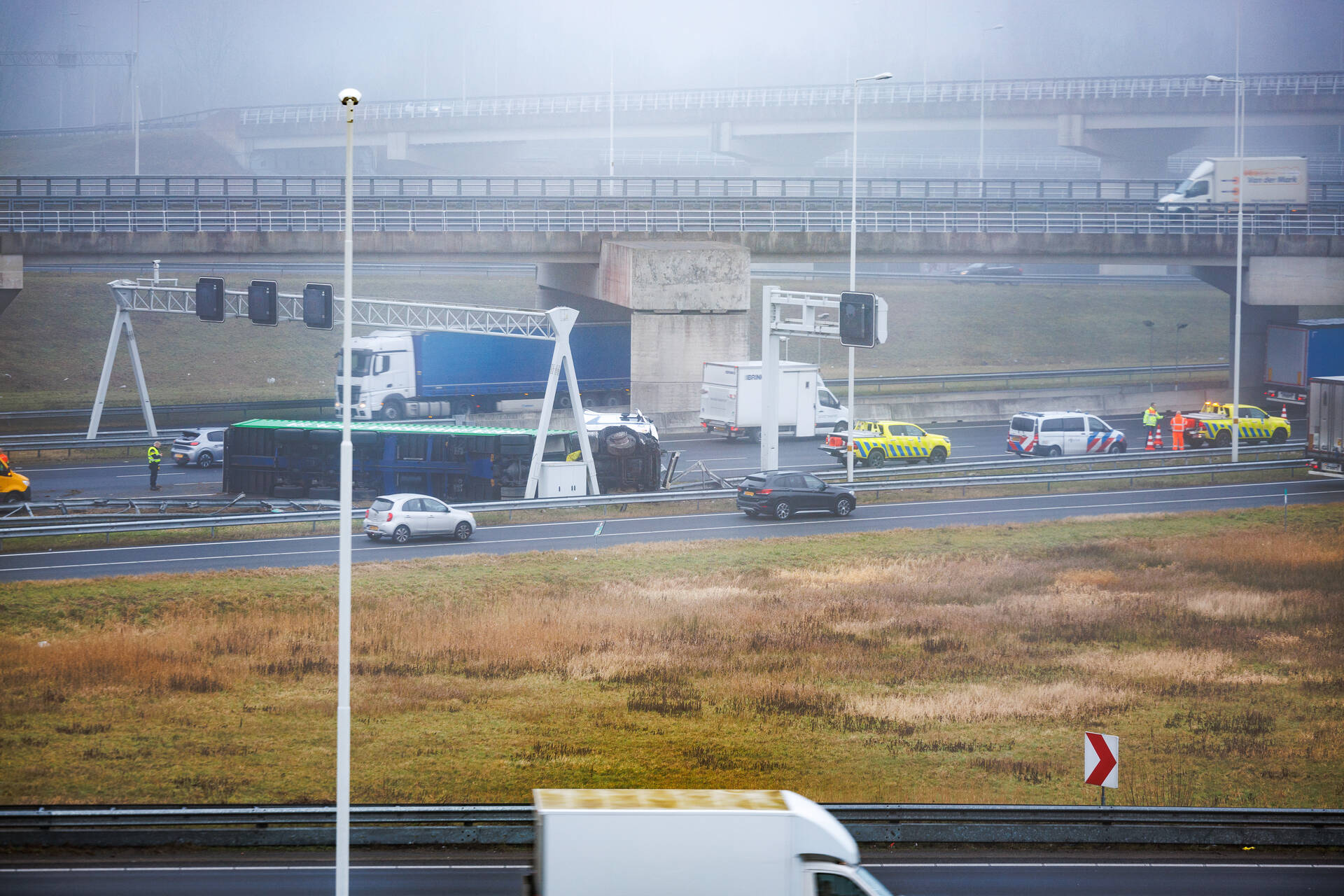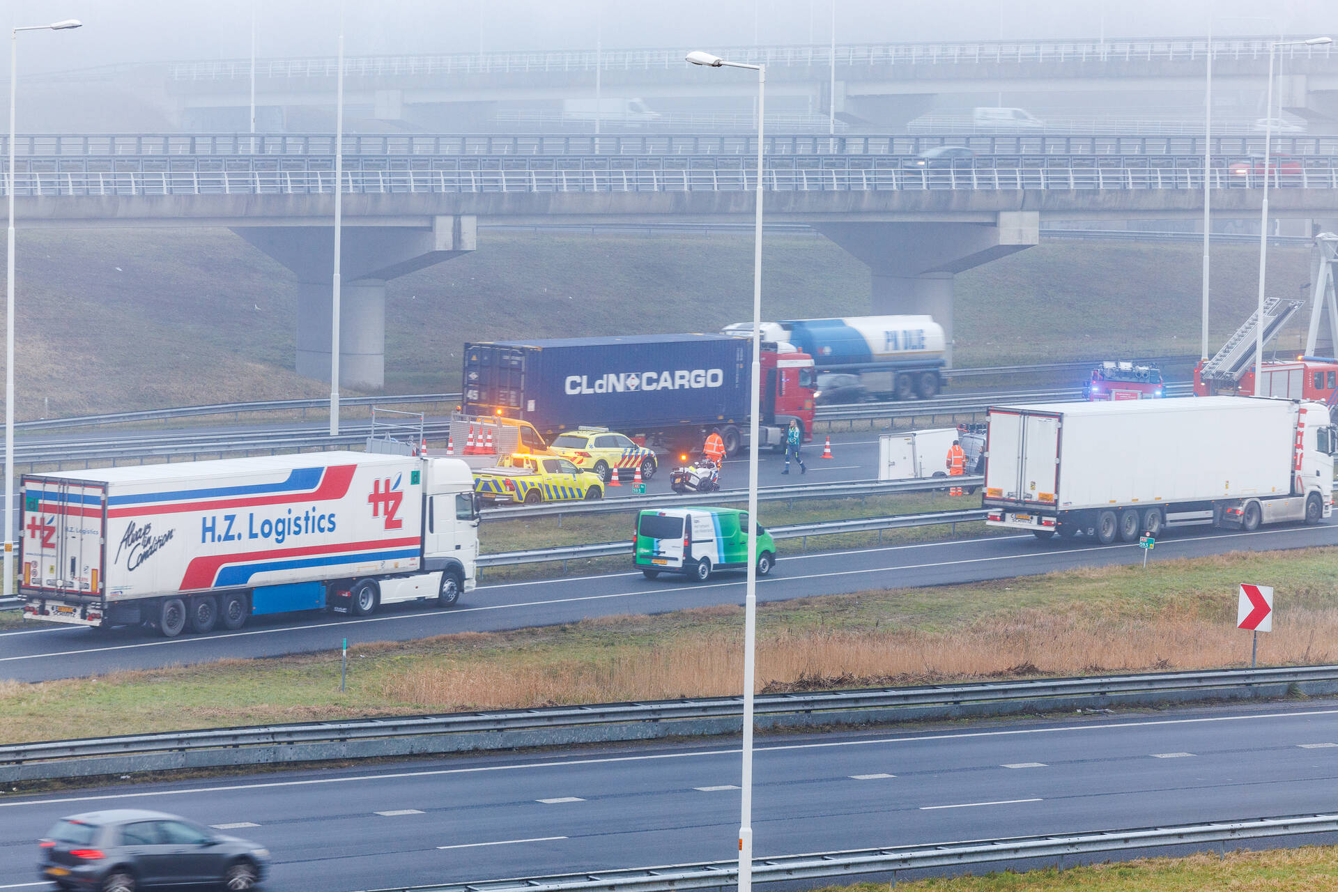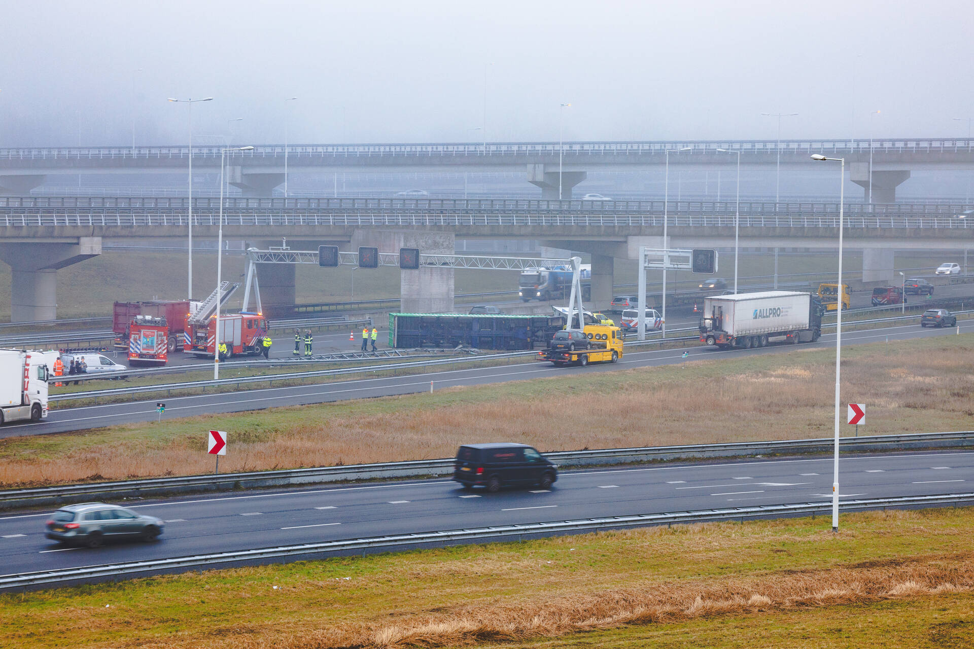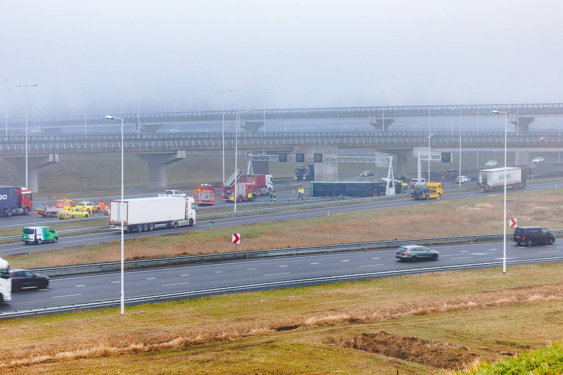 Op de snelweg is een vrachtwagen met oplegger gekanteld. Er zou ook een bestelbus met aanhanger bij betrokken zijn. Meerdere hulpdiensten zijn ingezet. Zover bekend is niemand gewond geraakt. Door het ongeval is deel van de snelweg afgesloten, dit zorgt voor de nodige verkeershinder.