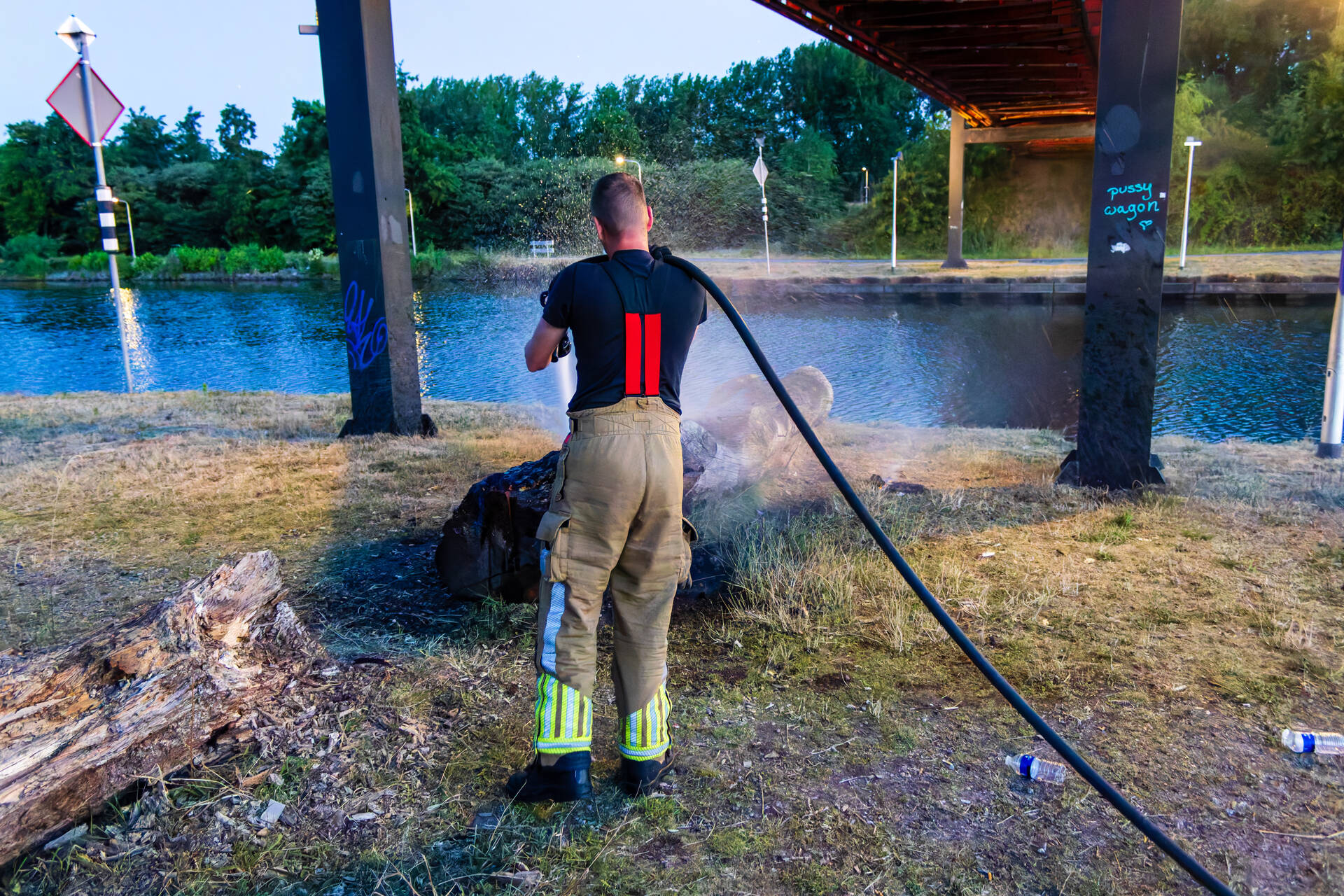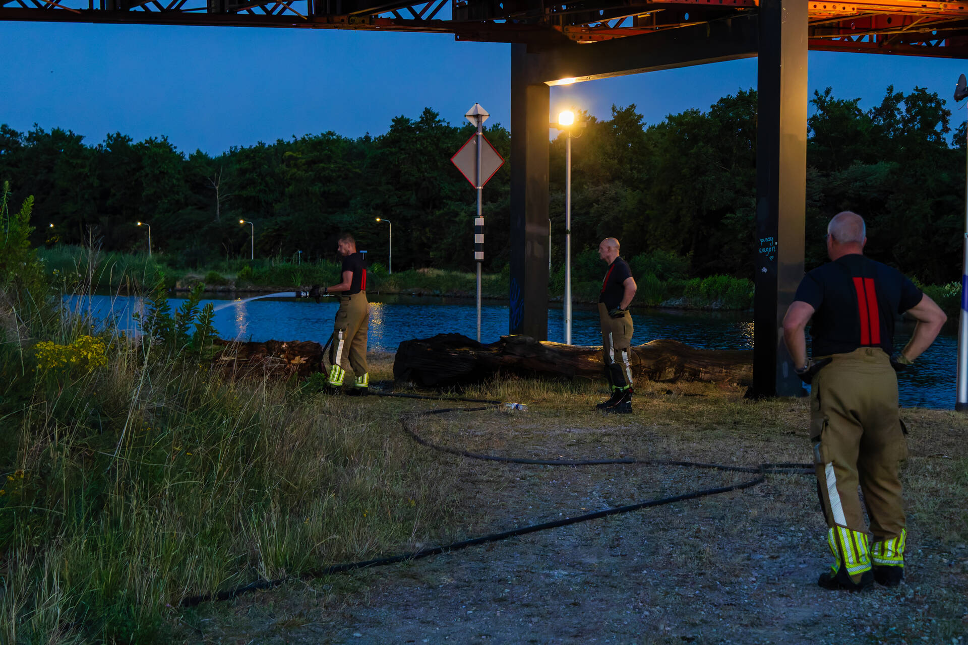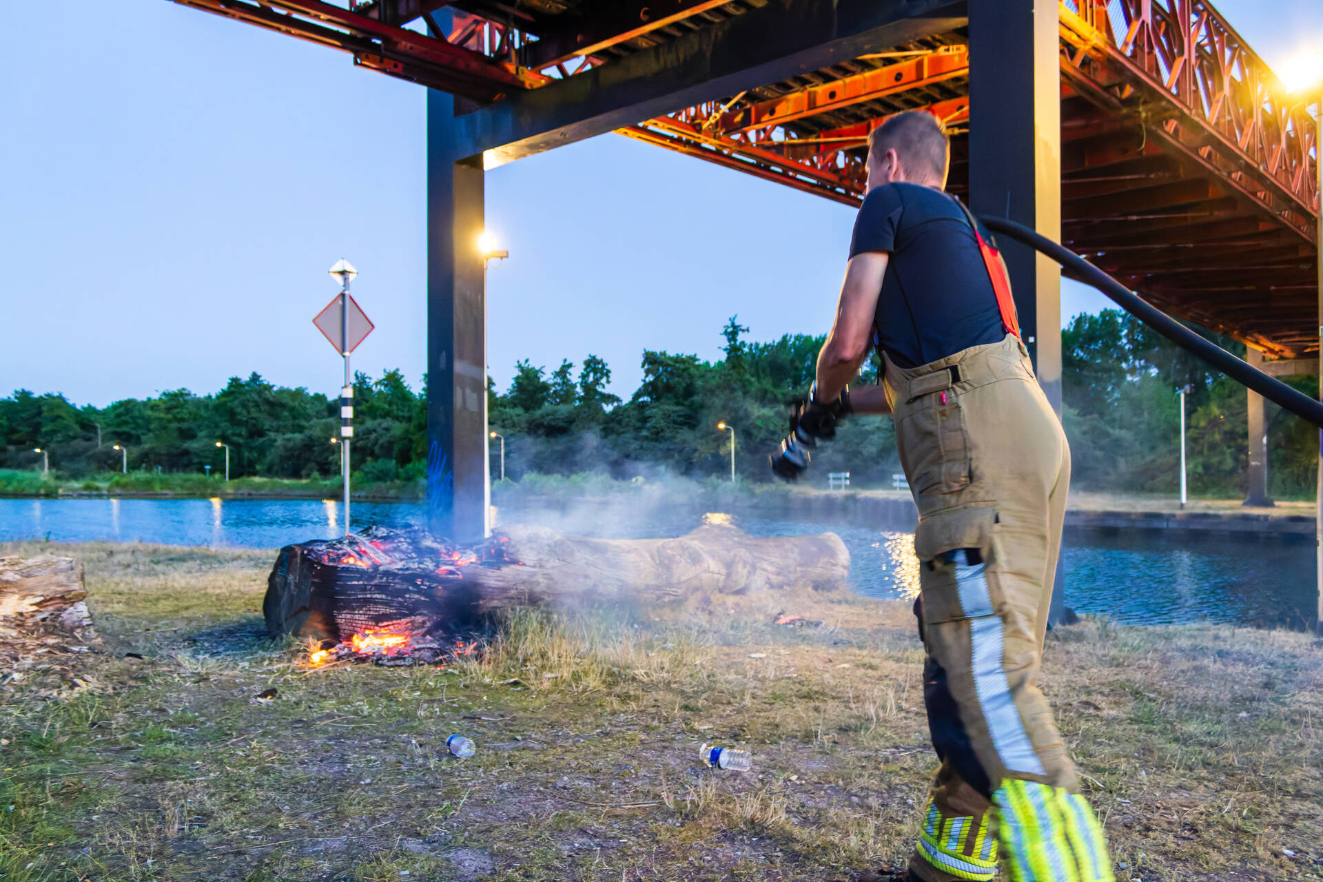 Een omstander zag op een afstand onder de brug rook en verwittigde snel de brandweer. Bij aankomst van de brandweer stond de boomstronk al flink te branden. Ze kregen het vuur snel onder controle.