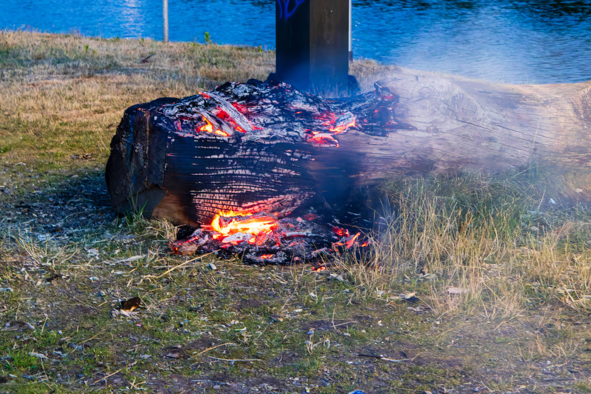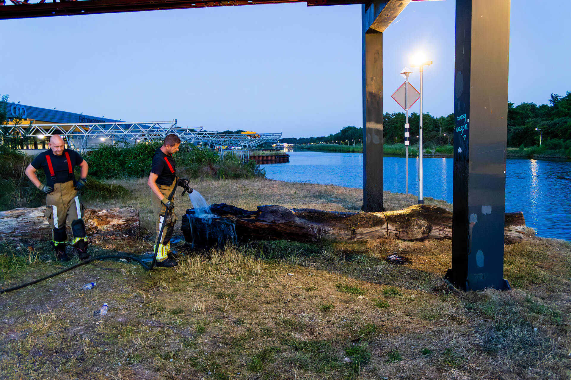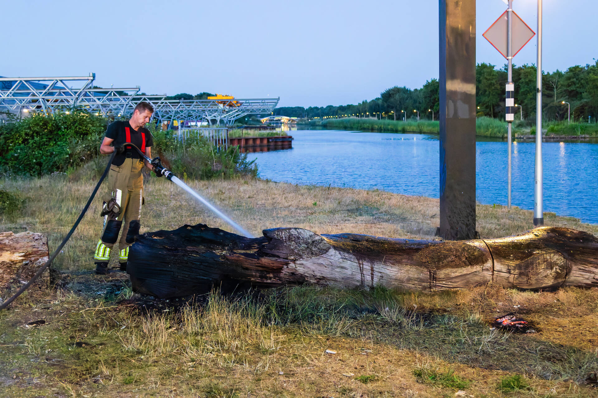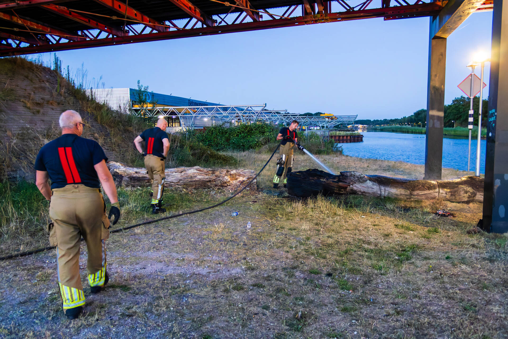 Een omstander zag op een afstand onder de brug rook en verwittigde snel de brandweer. Bij aankomst van de brandweer stond de boomstronk al flink te branden. Ze kregen het vuur snel onder controle.