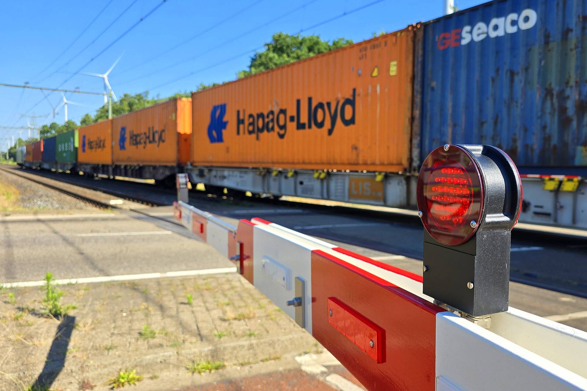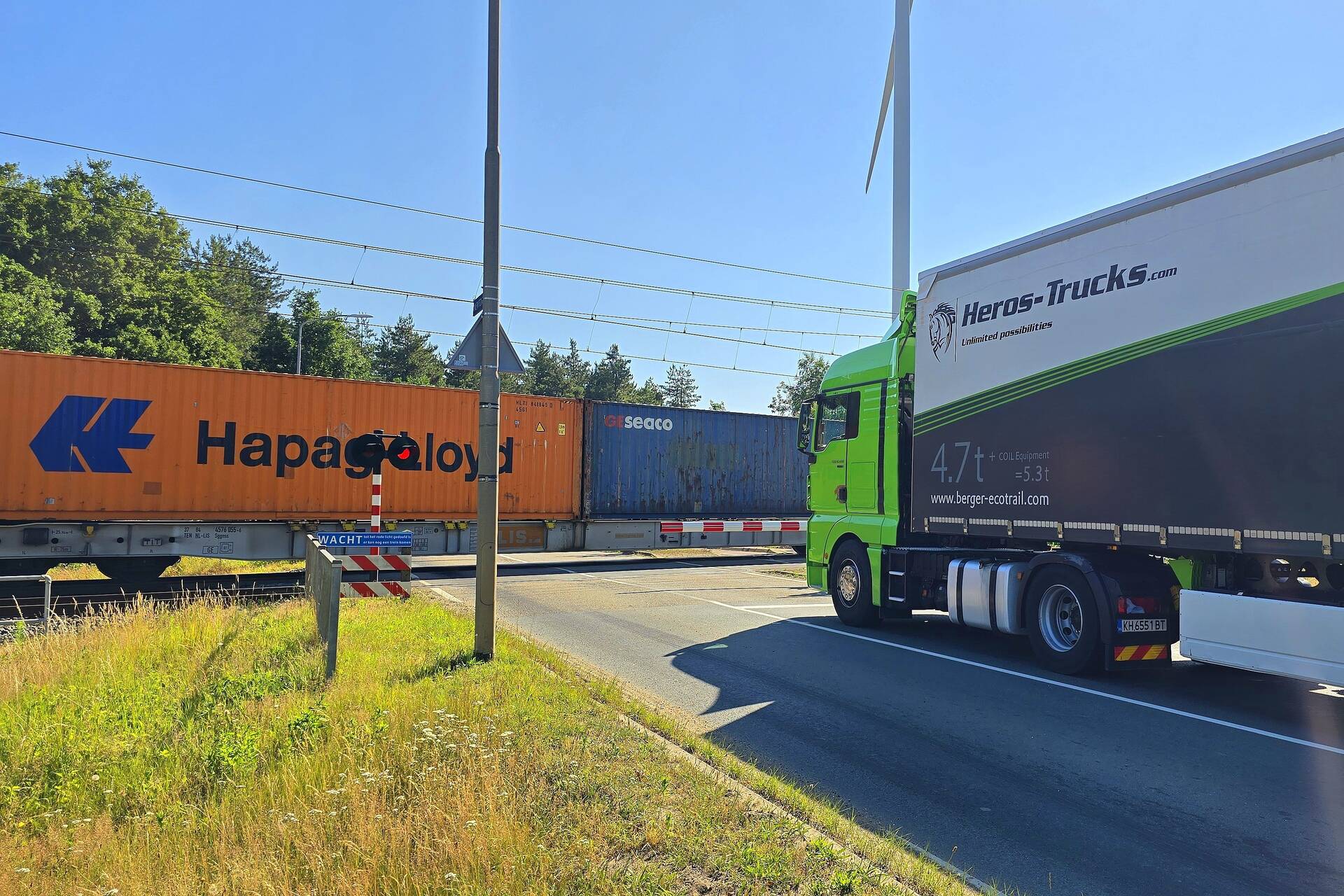 Een goederentrein raakte defect bij de spoorwegovergang, wat zorgde voor aanzienlijke filevorming. Andere treinen kunnen er voorzichtig langs, maar moeten stapvoets rijden en luid toeteren bij de overgang, wat vertraging veroorzaakt.
