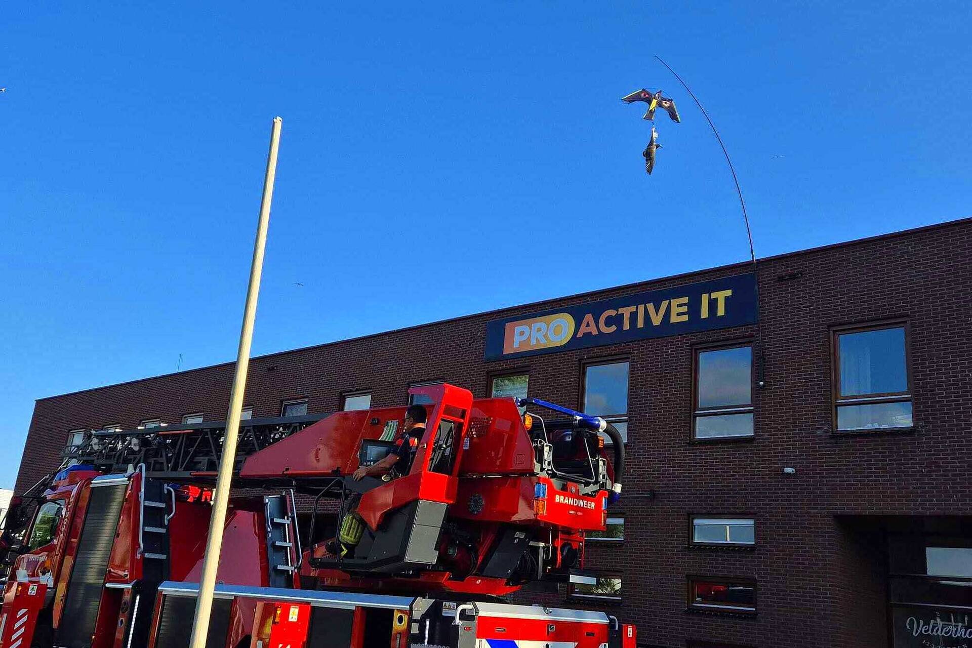 Een vogel kwam vast te zitten in een vogelverschrikkervlieger. De brandweer wist het dier te bevrijden en droeg het vervolgens over aan de dierenambulance. De brandweer reageerde snel op de melding en arriveerde kort na de oproep. Door gebruik te maken van een ladderwagen konden de brandweerlieden het dier veilig benaderen en uit zijn benarde positie bevrijden.