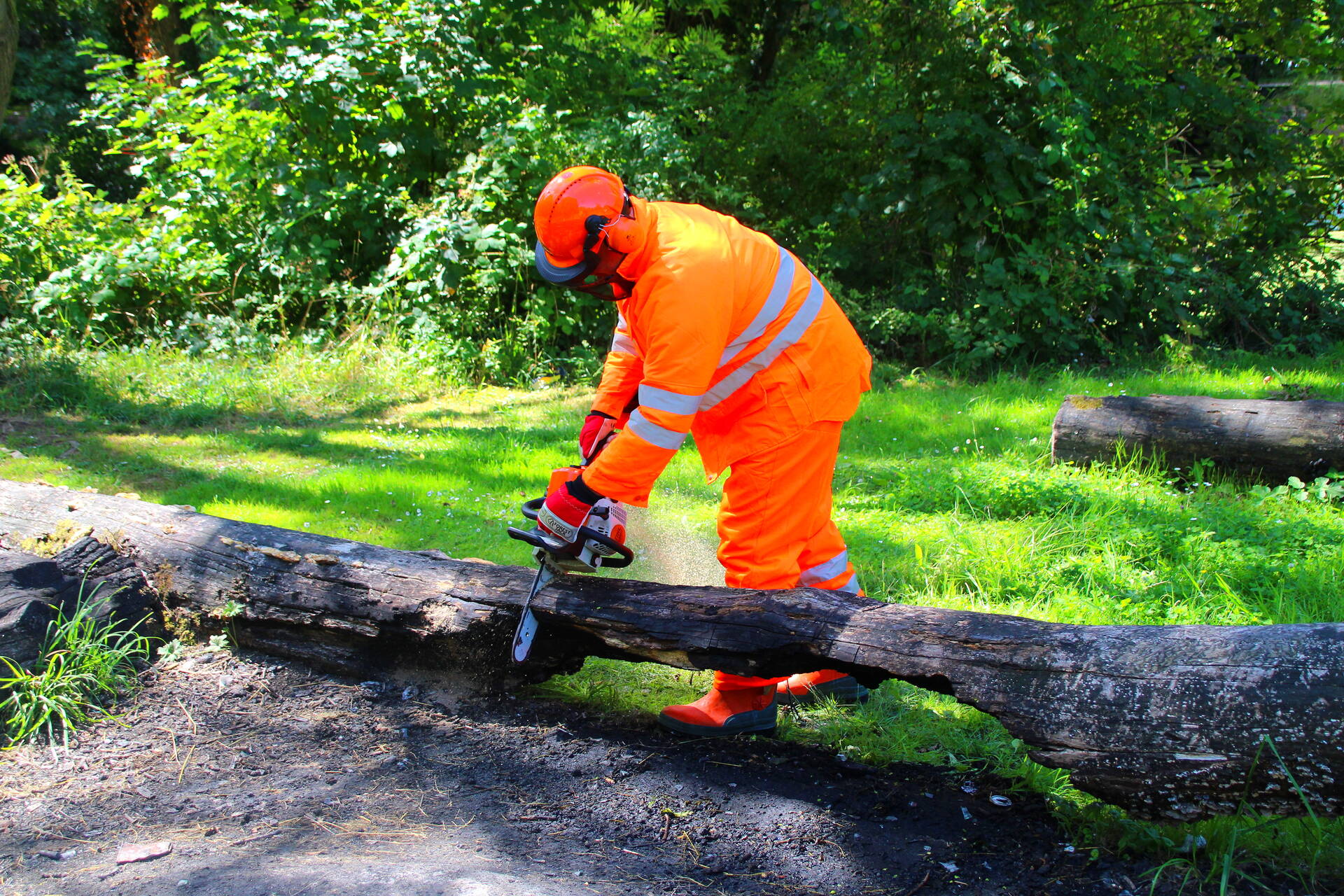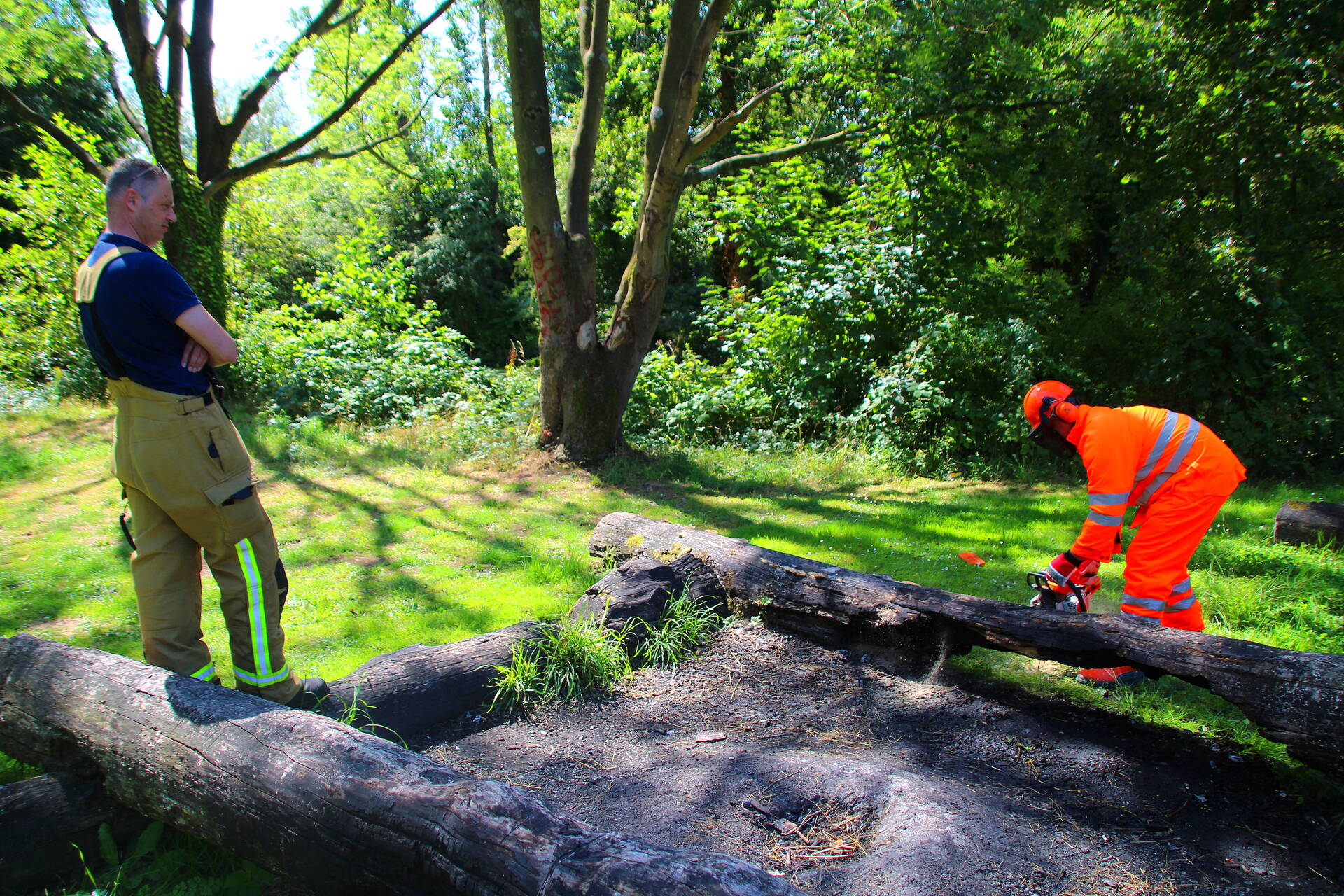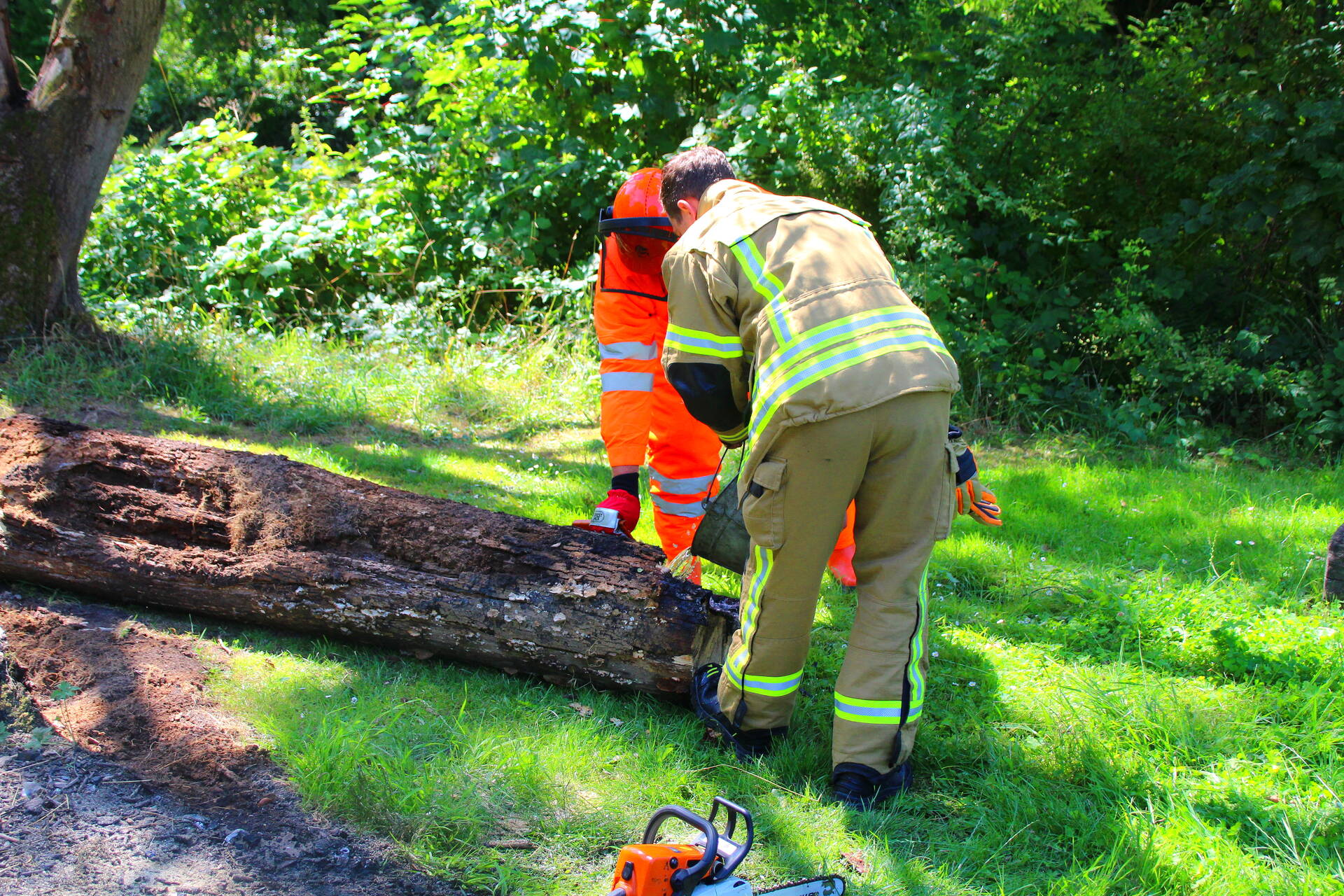 Brandweer blust boomstam na oversteek