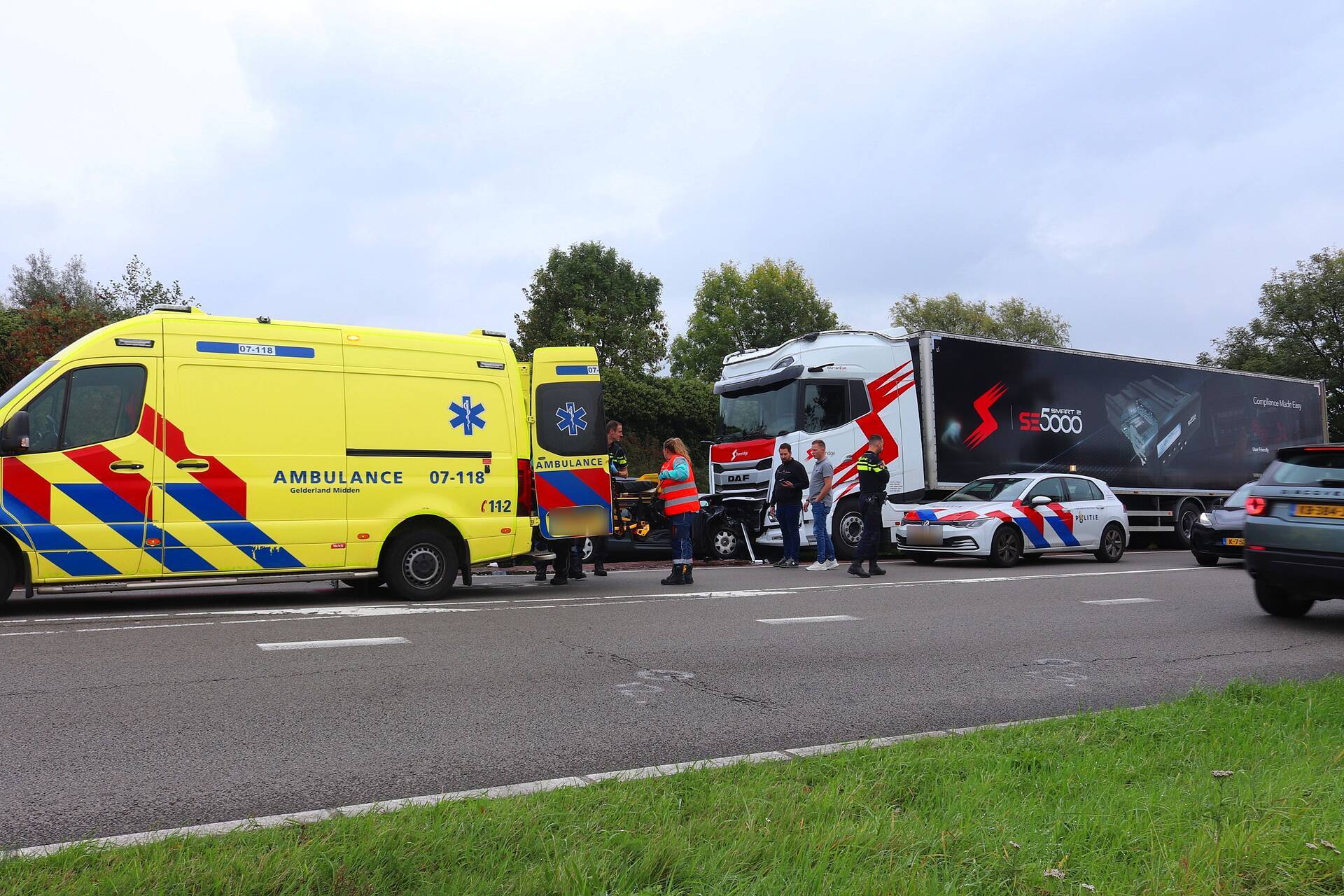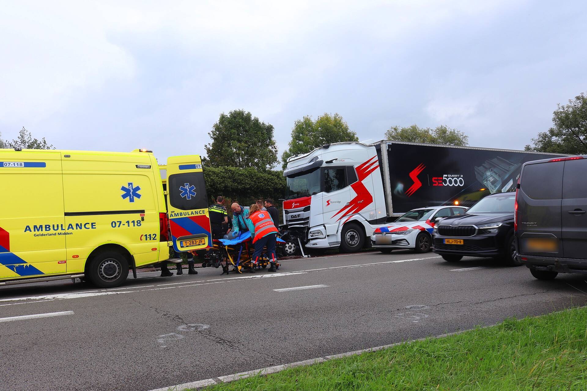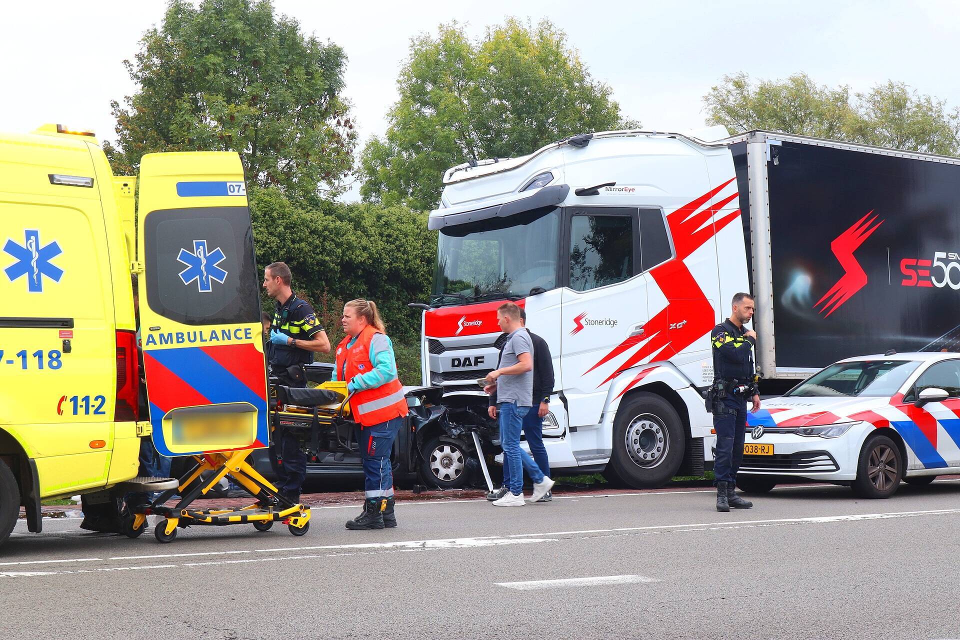 Een personenwagen is frontaal gebotst op een geparkeerde vrachtwagen. De bestuurder van de auto raakte gewond en werd gecontroleerd door medische hulpverleners. Vanwege de ernst van de situatie, waarvoor dringend inzet met haast geboden was, werden brandweereenheden snel naar de locatie gestuurd.