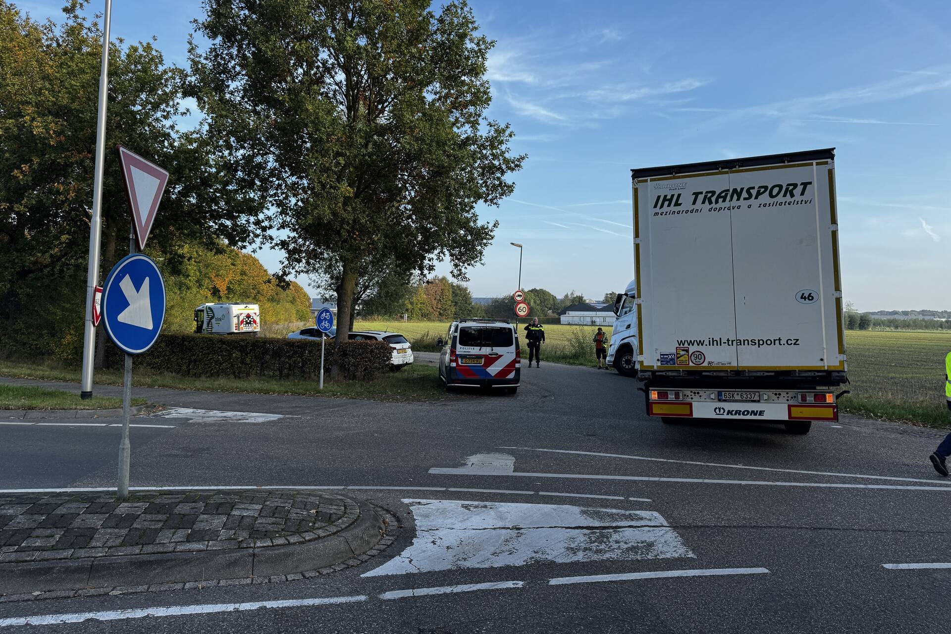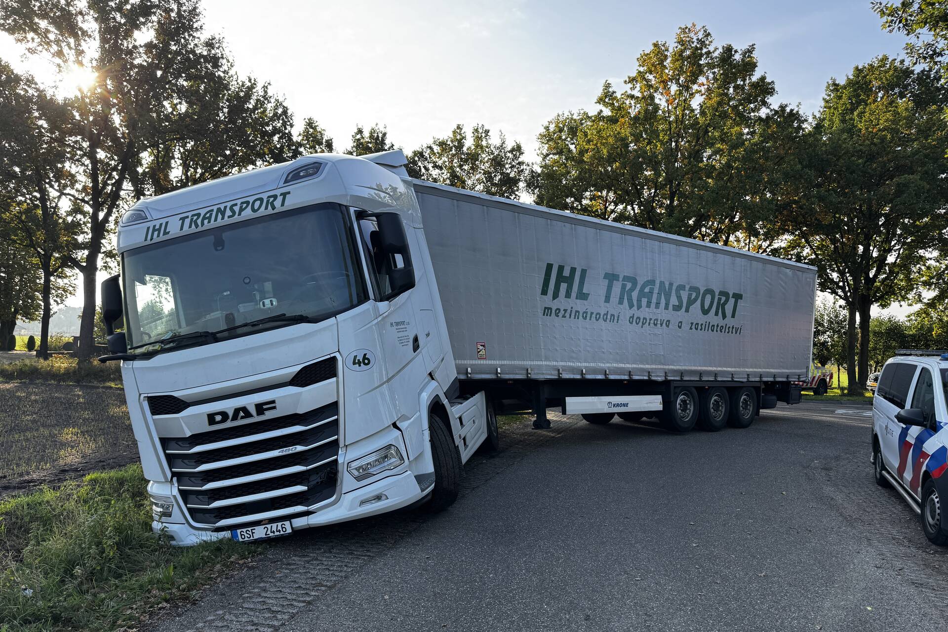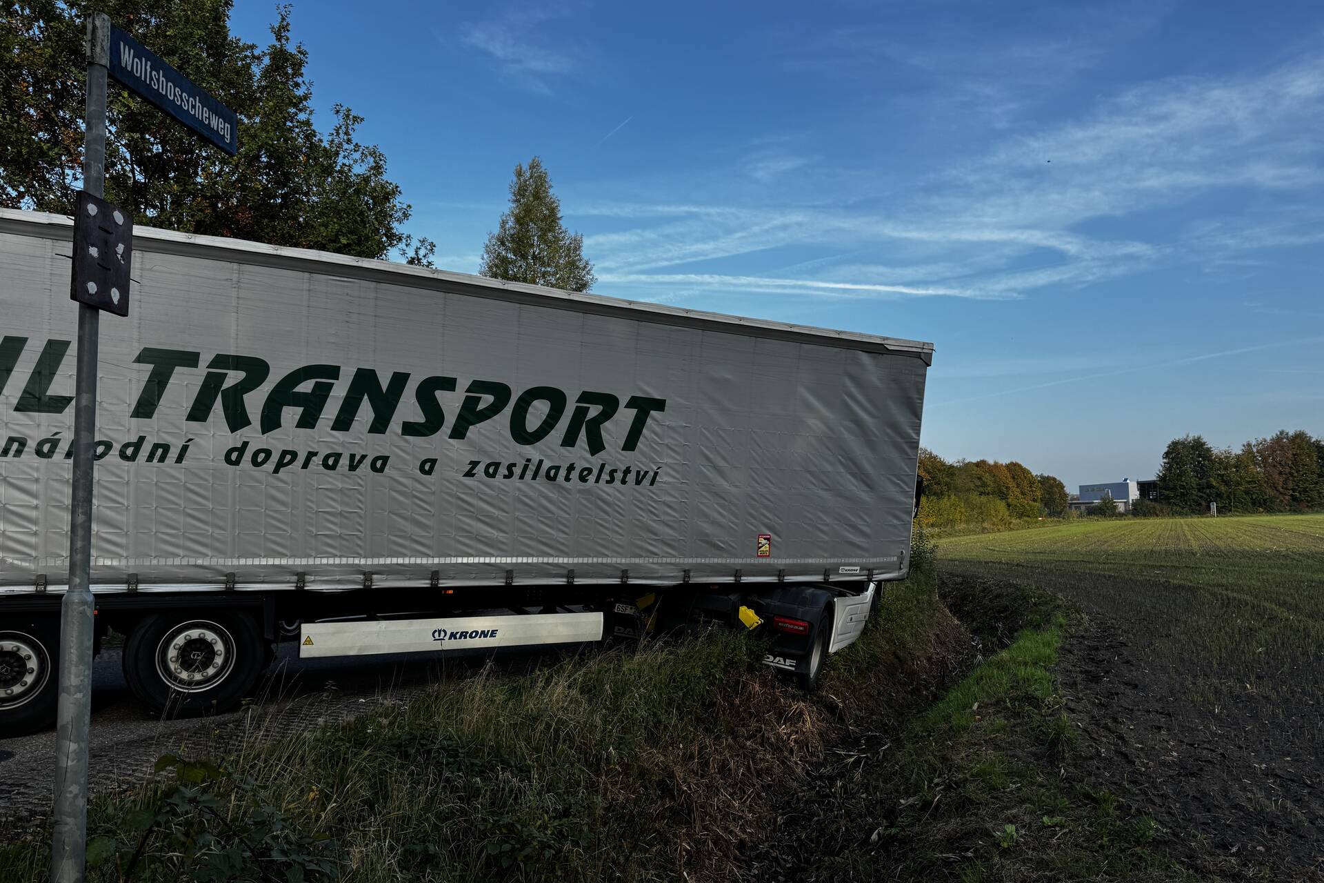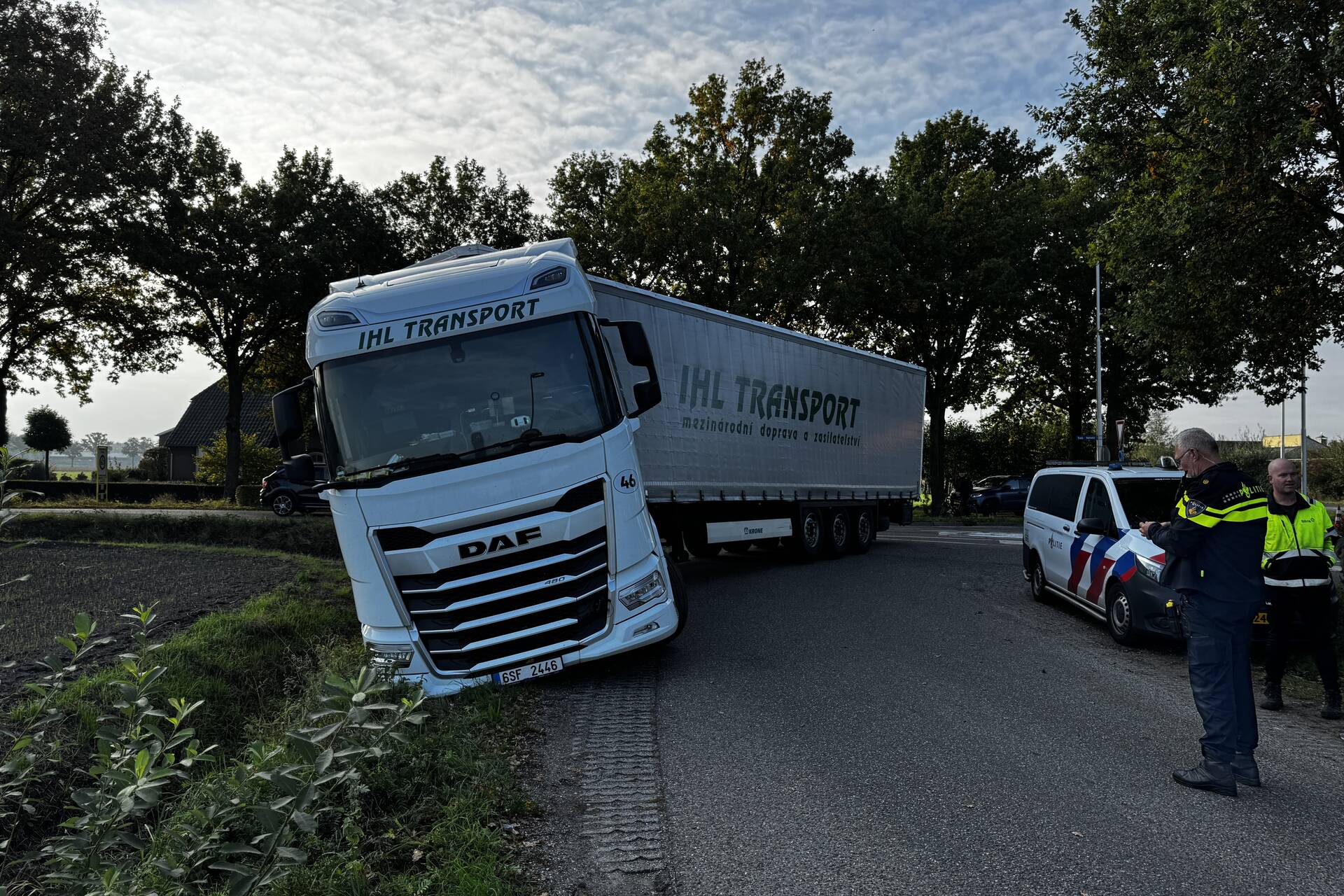 De trekker met oplegger zakte in de natte berm en kwam deels in een sloot terecht. De vrachtwagencombinatie uit Tsjechië kon daardoor niet verder rijden. Een bergingsbedrijf werd gealarmeerd om het voertuig weer op de weg te zetten. Het is nog onbekend waarom de chauffeur zover de berm inreed.