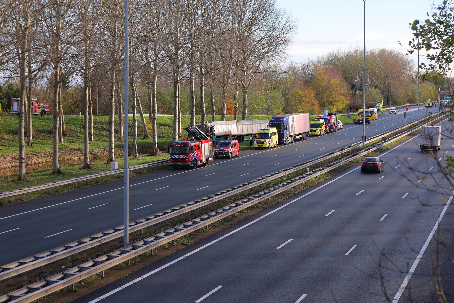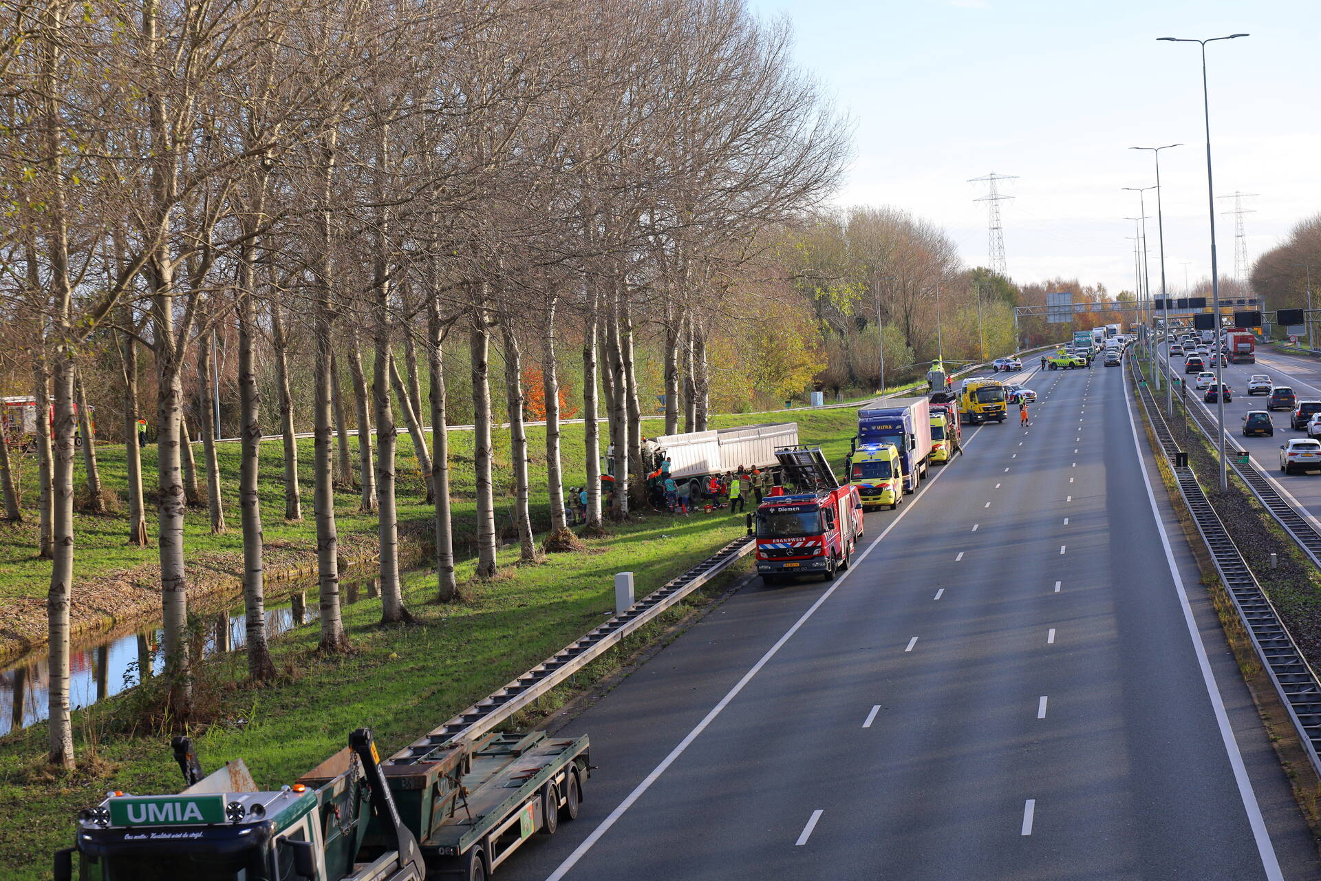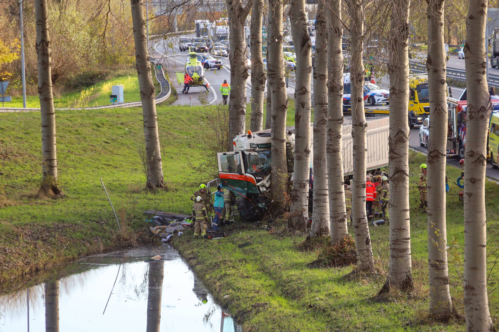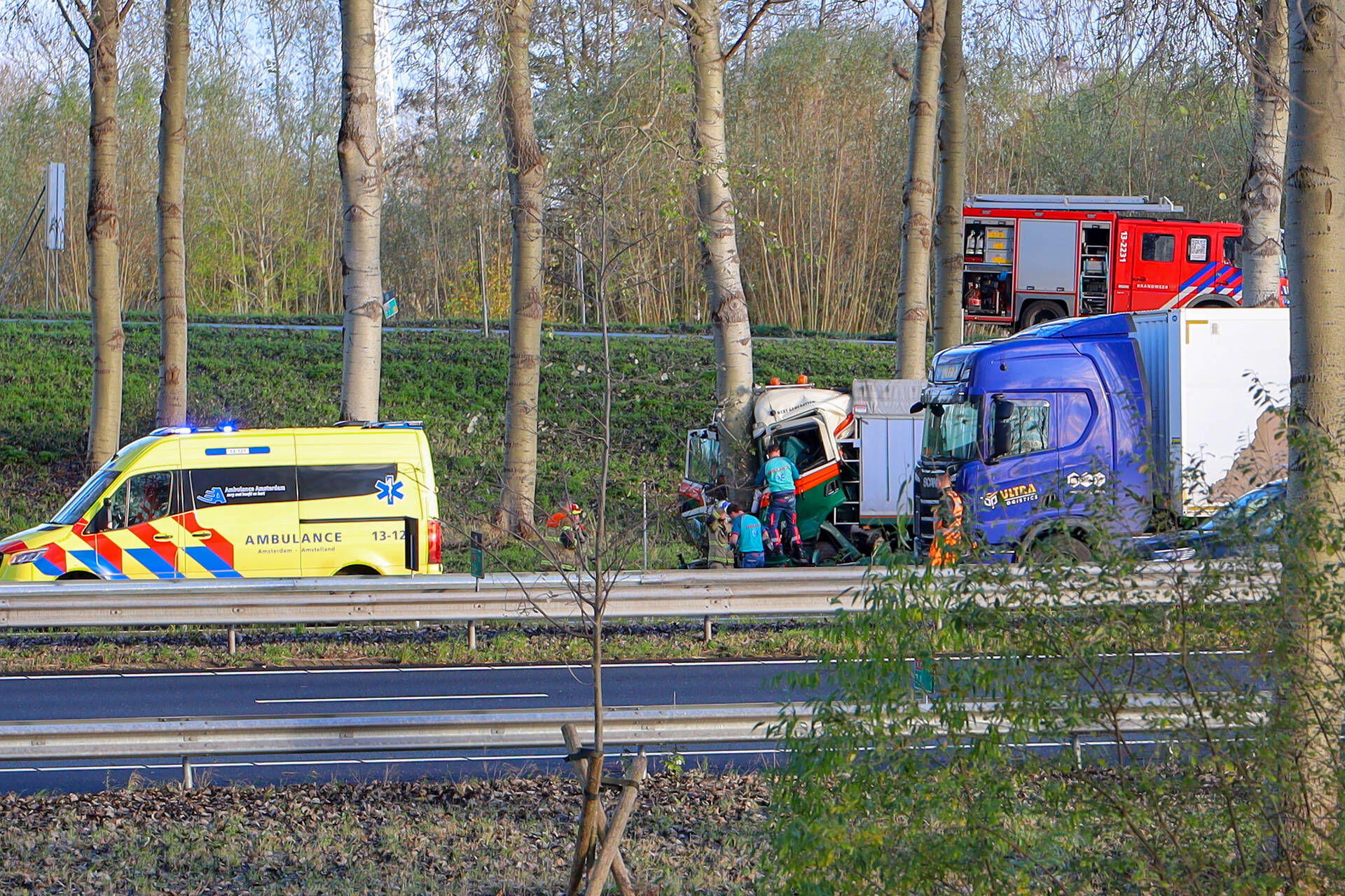 AMSTERDAM - In de middag van dinsdag 25 november rond 14.00 uur heeft zich een ongeval voorgedaan aan de Ringweg-Noord in Amsterdam. Een vrachtwagen is tegen een boom gereden, waardoor de chauffeur zwaargewond raakte. Hulpdiensten waren snel ter plaatse om de bestuurder uit het voertuig te bevrijden en medische zorg te verlenen. De ernst van de verwondingen maakt dat de situatie zorgwekkend is.