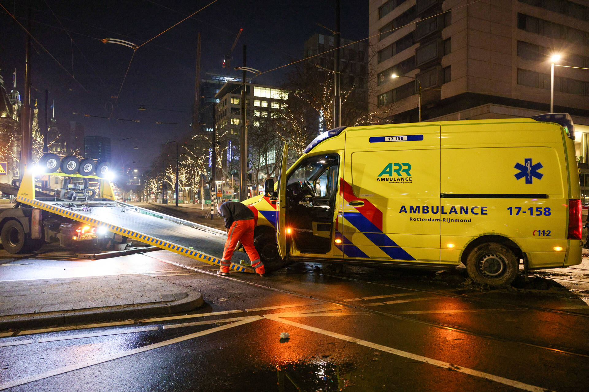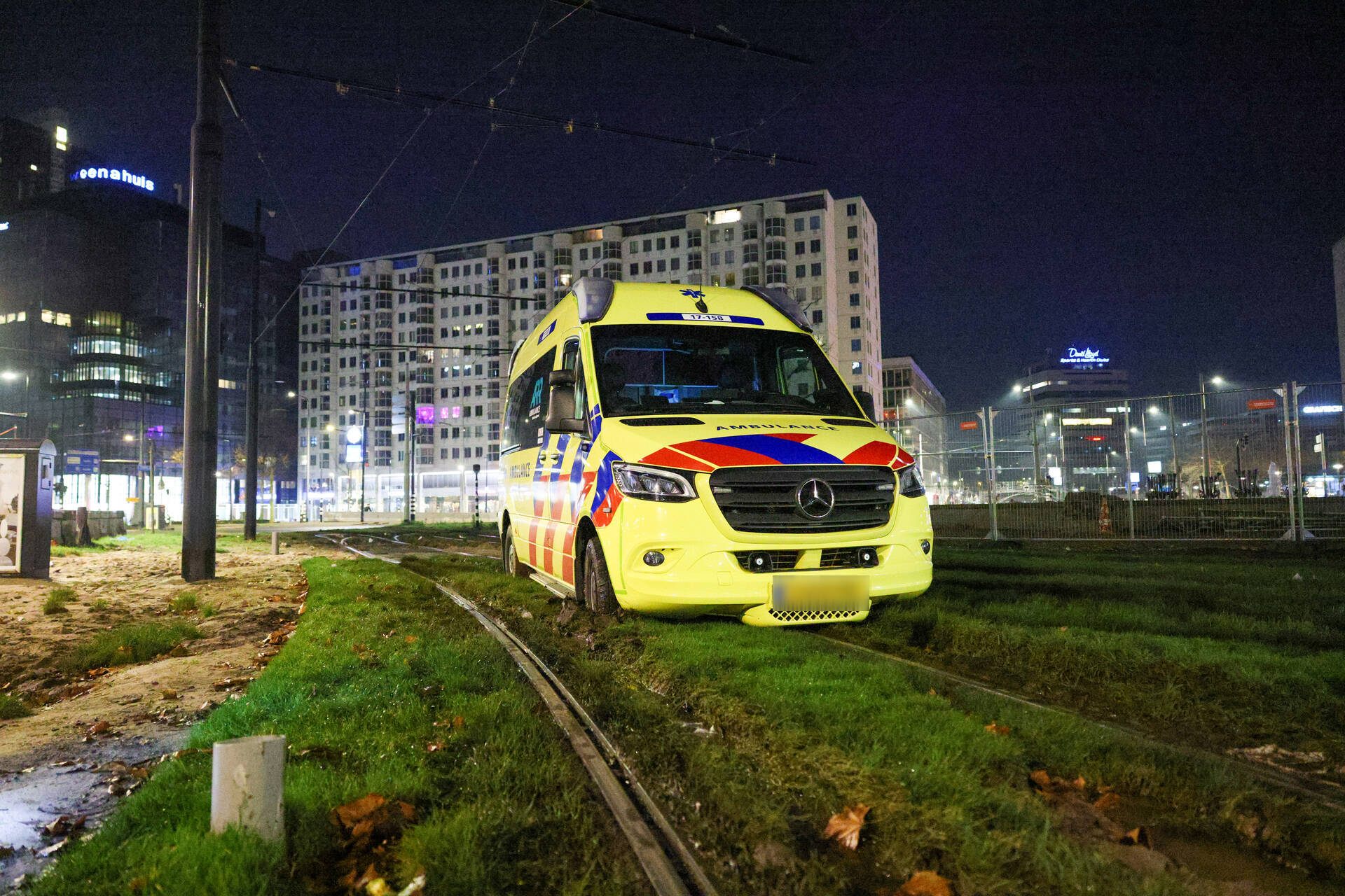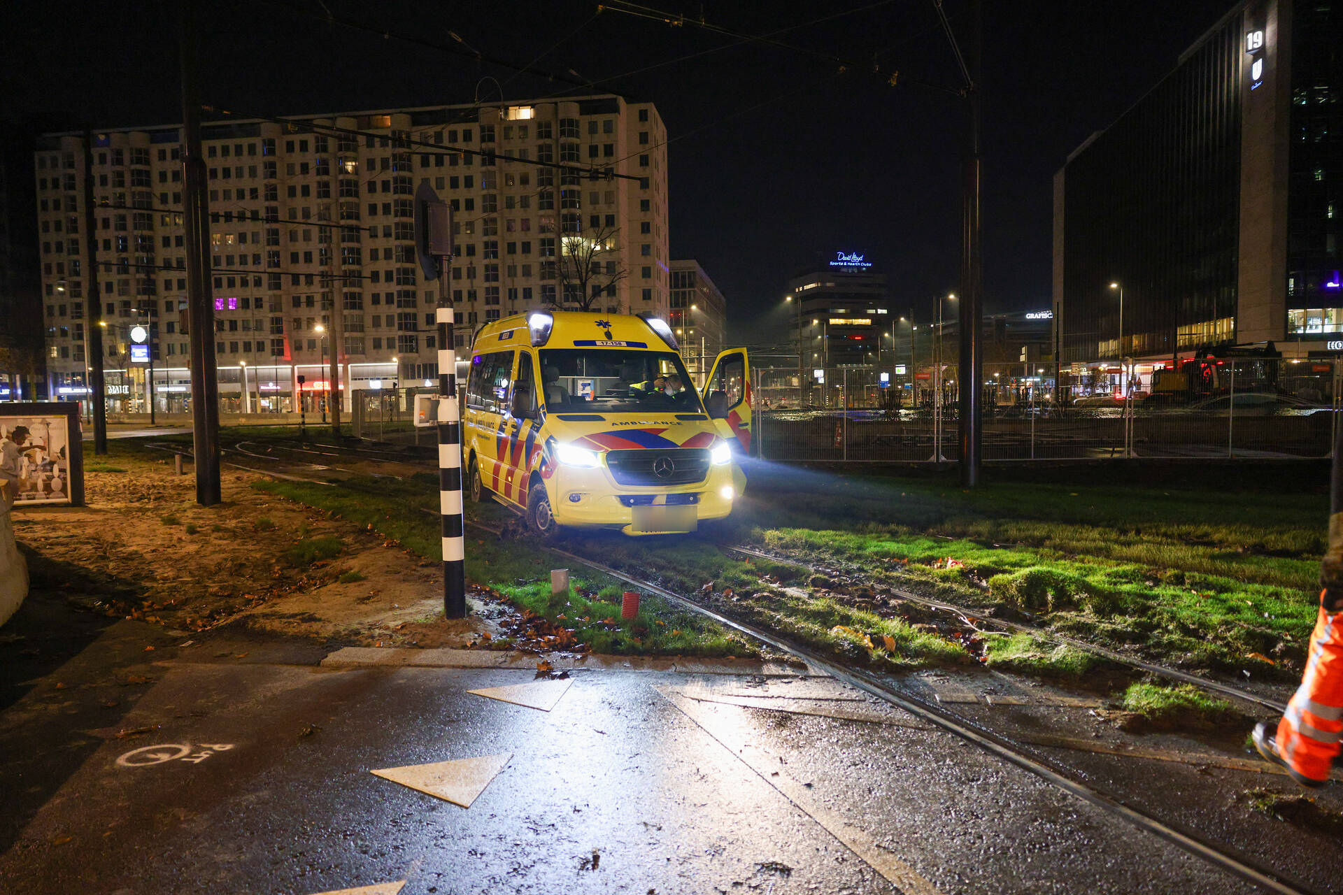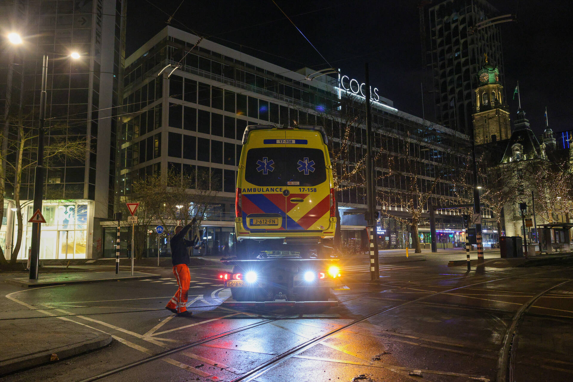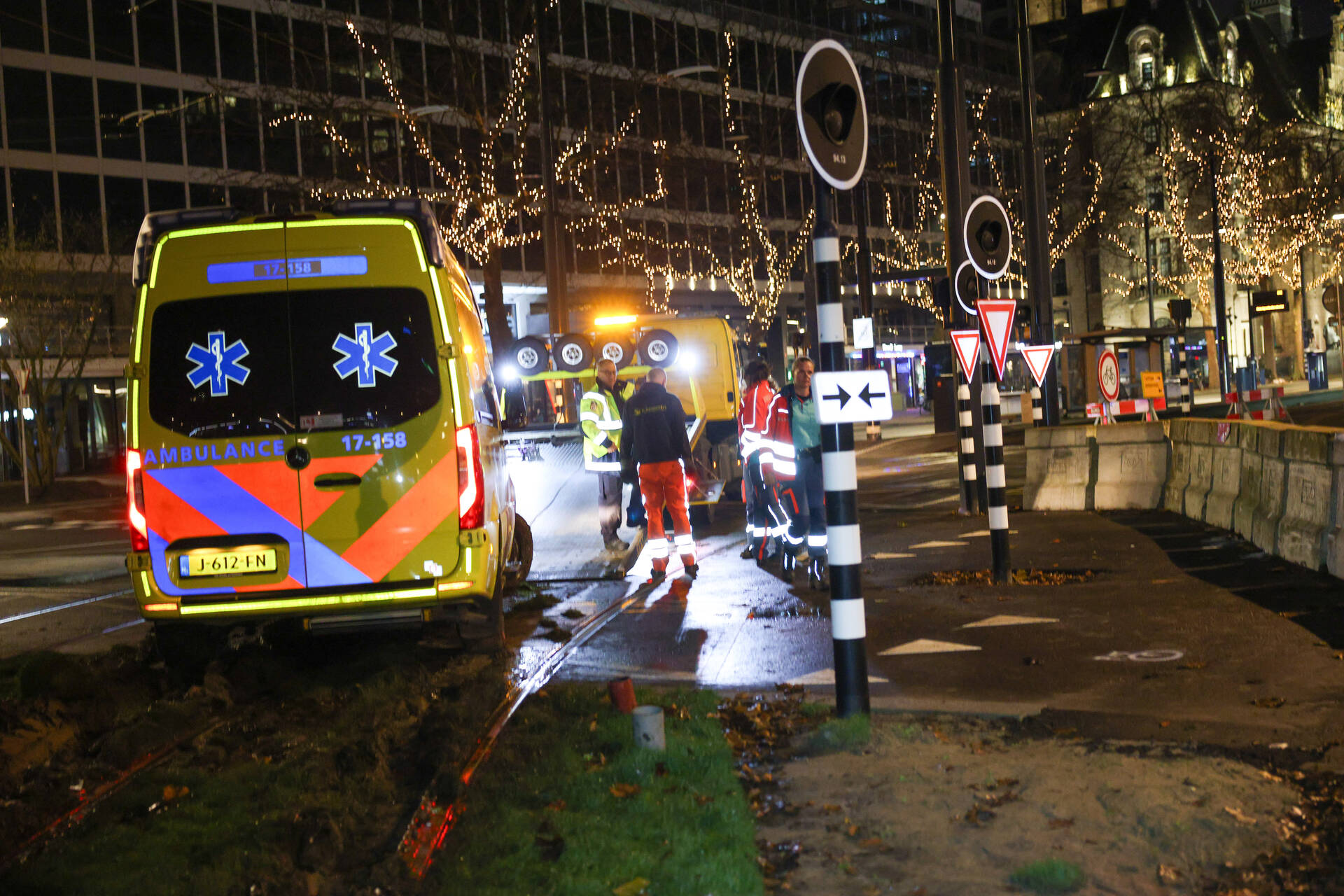 Een ambulance was onderweg naar een melding in de Marnixstraat toen het voertuig op het Hofplein vast kwam te zitten. Een berger heeft het voertuig afgesleept.