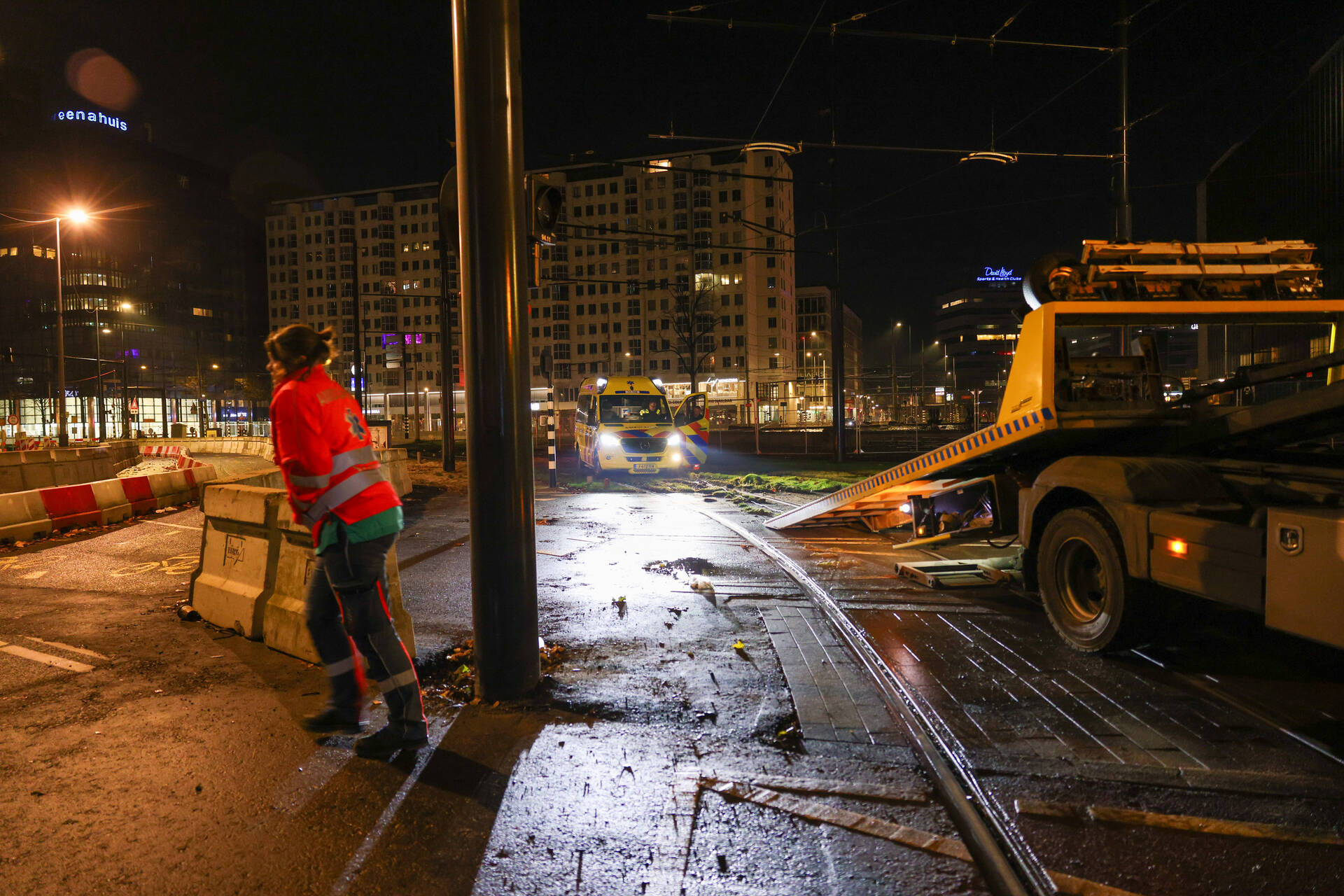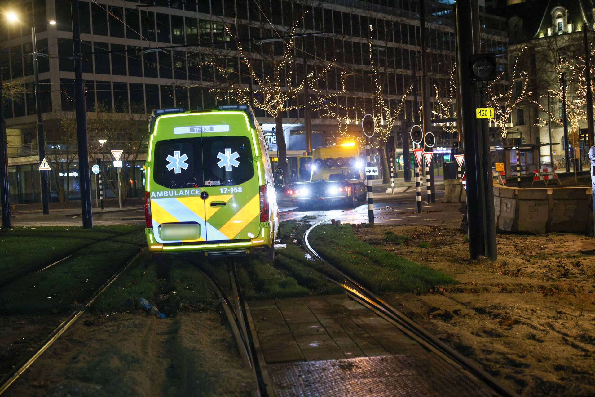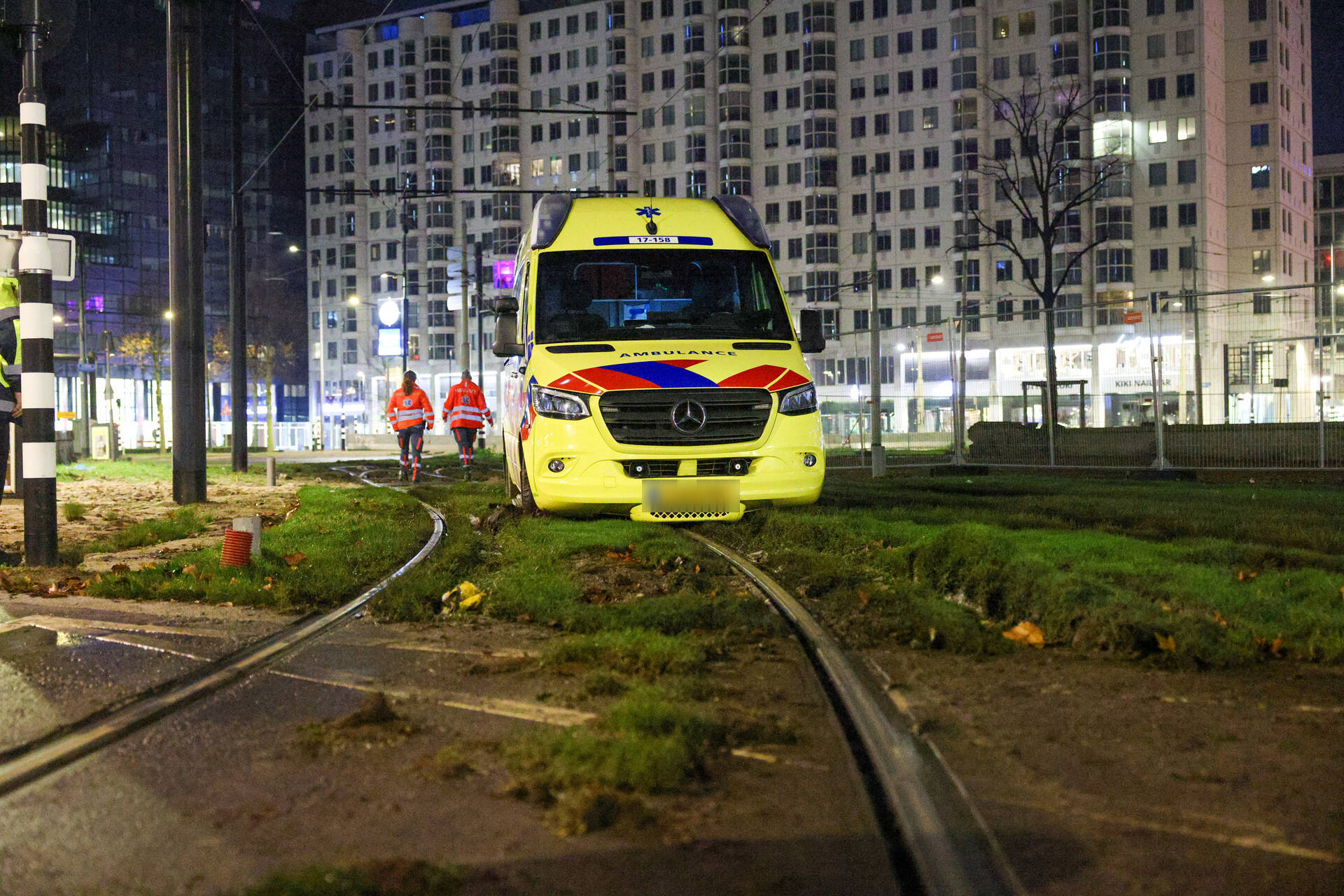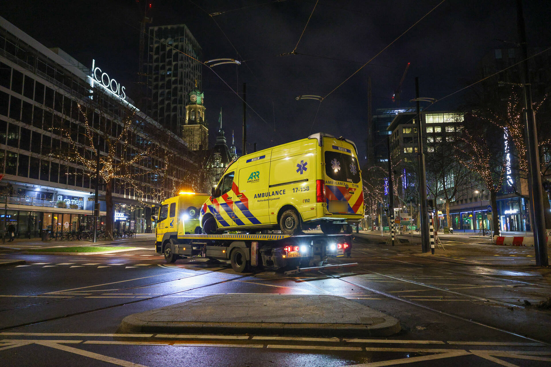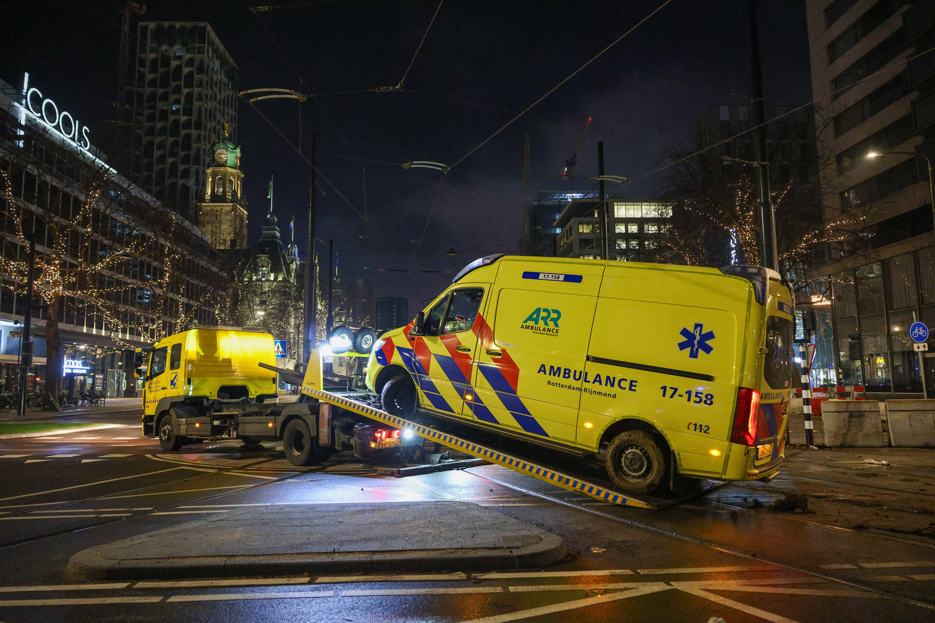 Een ambulance was onderweg naar een melding in de Marnixstraat toen het voertuig op het Hofplein vast kwam te zitten. Een berger heeft het voertuig afgesleept.