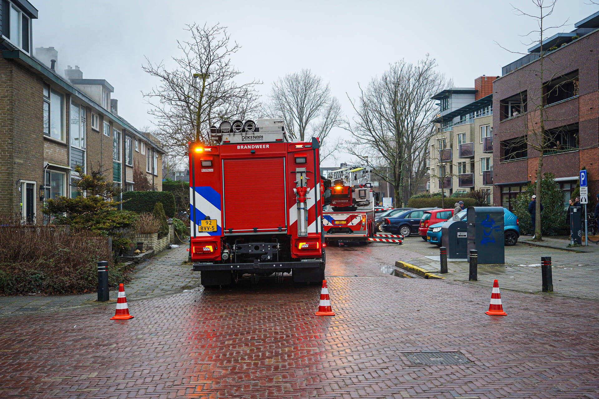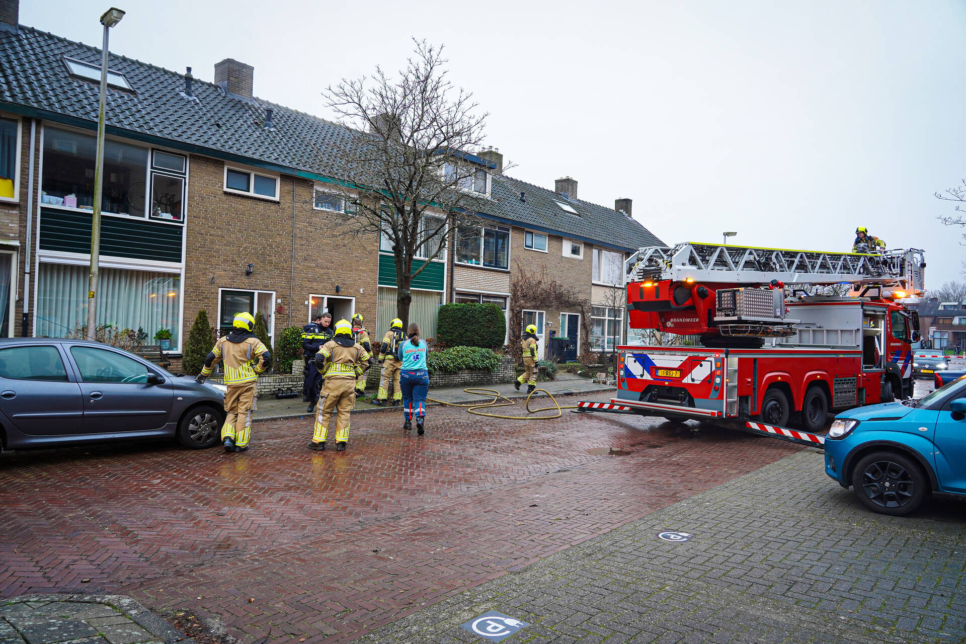 Het zolderraam is zwart geblakerd en tijdens de brandbestrijding kwam veel rook vrij. De kat is uit de woning gehaald en word beademd door de ambulancedienst.