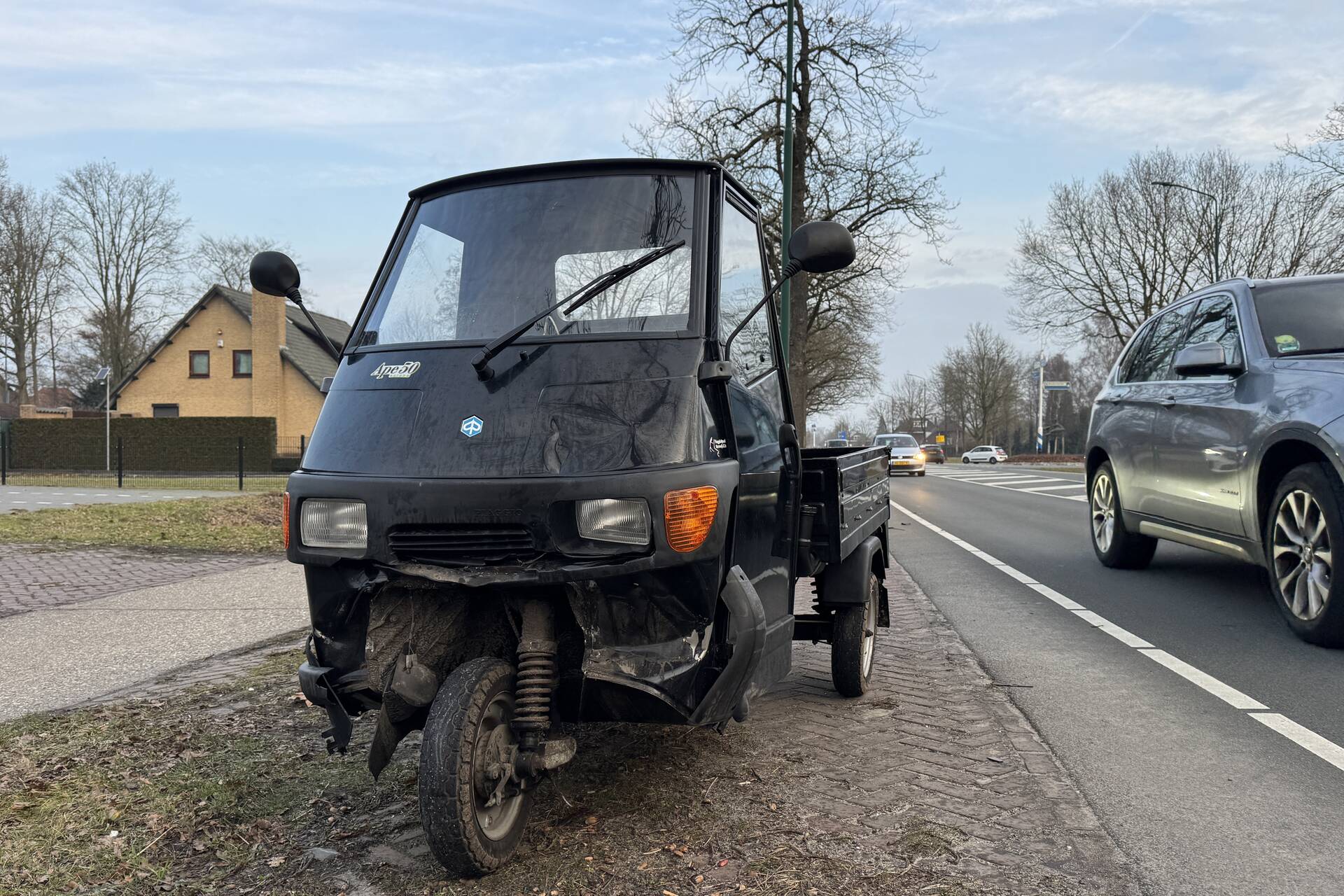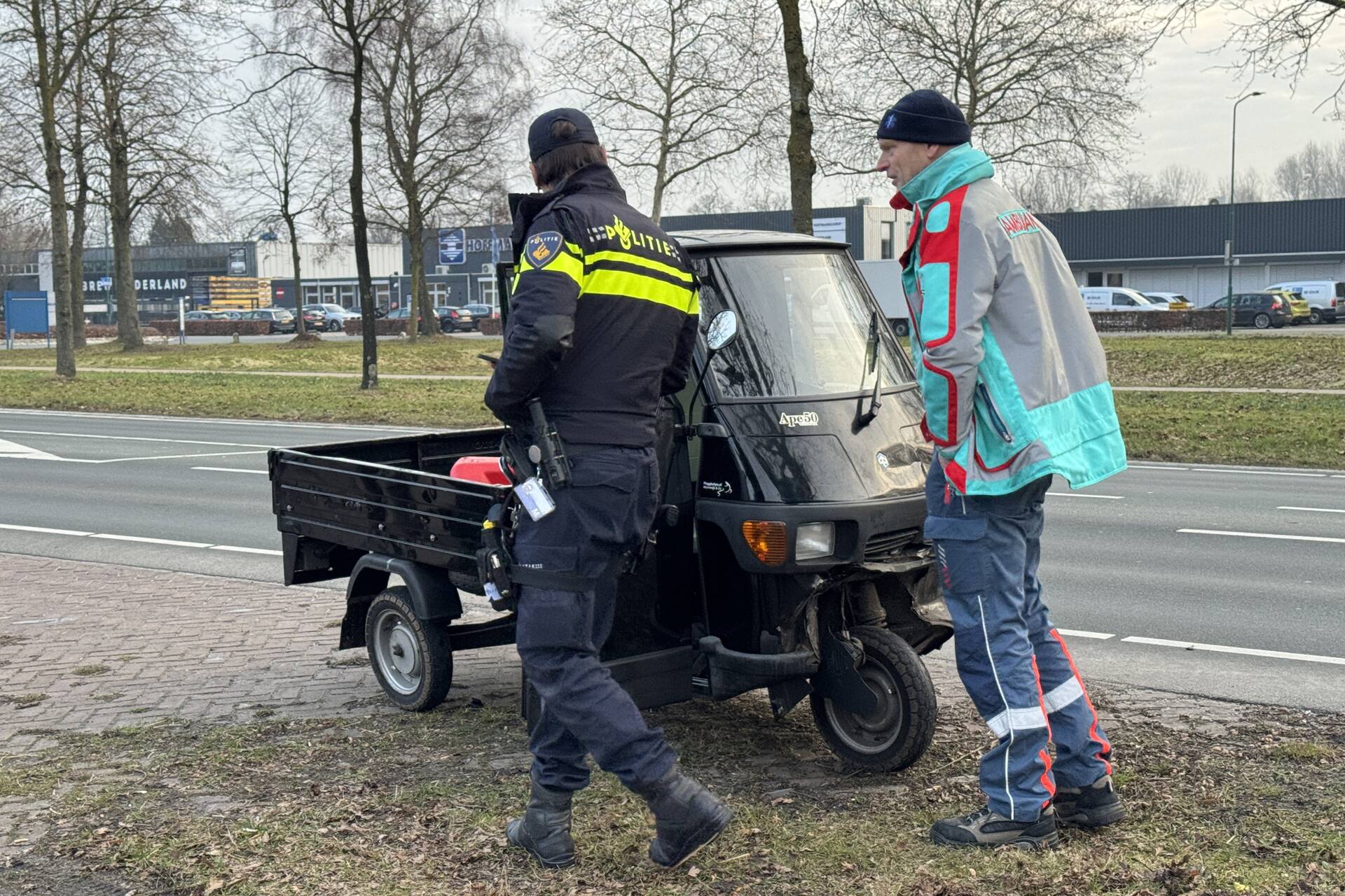 Hij liep letsel op aan zijn gezicht en is door ambulancepersoneel behandeld. De piaggo is door een berger opgehaald, terwijl de auto zijn reis kon vervolgen.