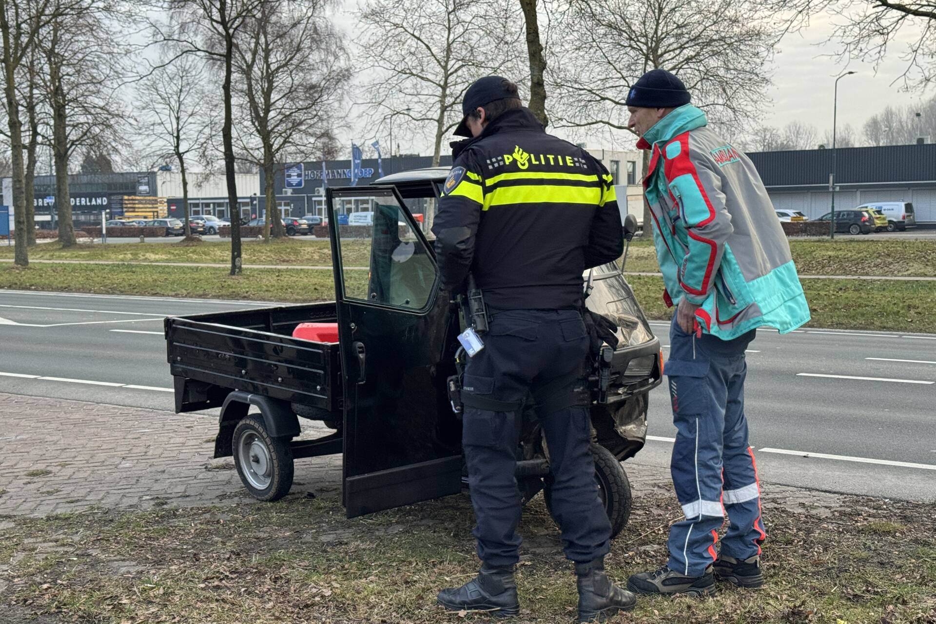 Een piaggo botste achter op een personenauto die plotseling moest remmen voor een afslaande vrachtwagen. De bestuurder van de piaggo zag dit te laat en kwam hard in botsing met de auto.