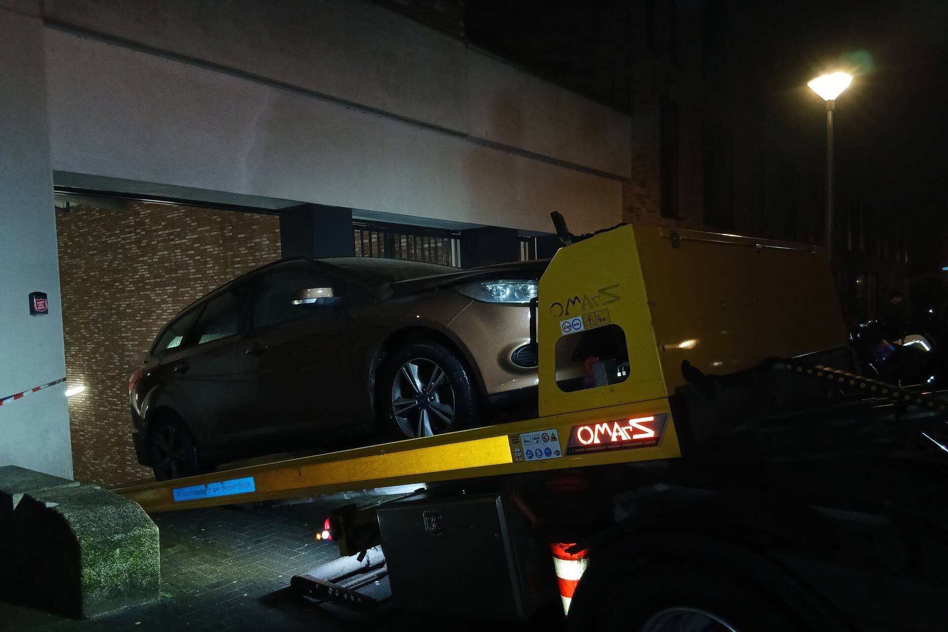 Een berger heeft het voertuig uit de garage gehaald en geborgen. De situatie werd verder geanalyseerd om de oorzaak van het incident te achterhalen.