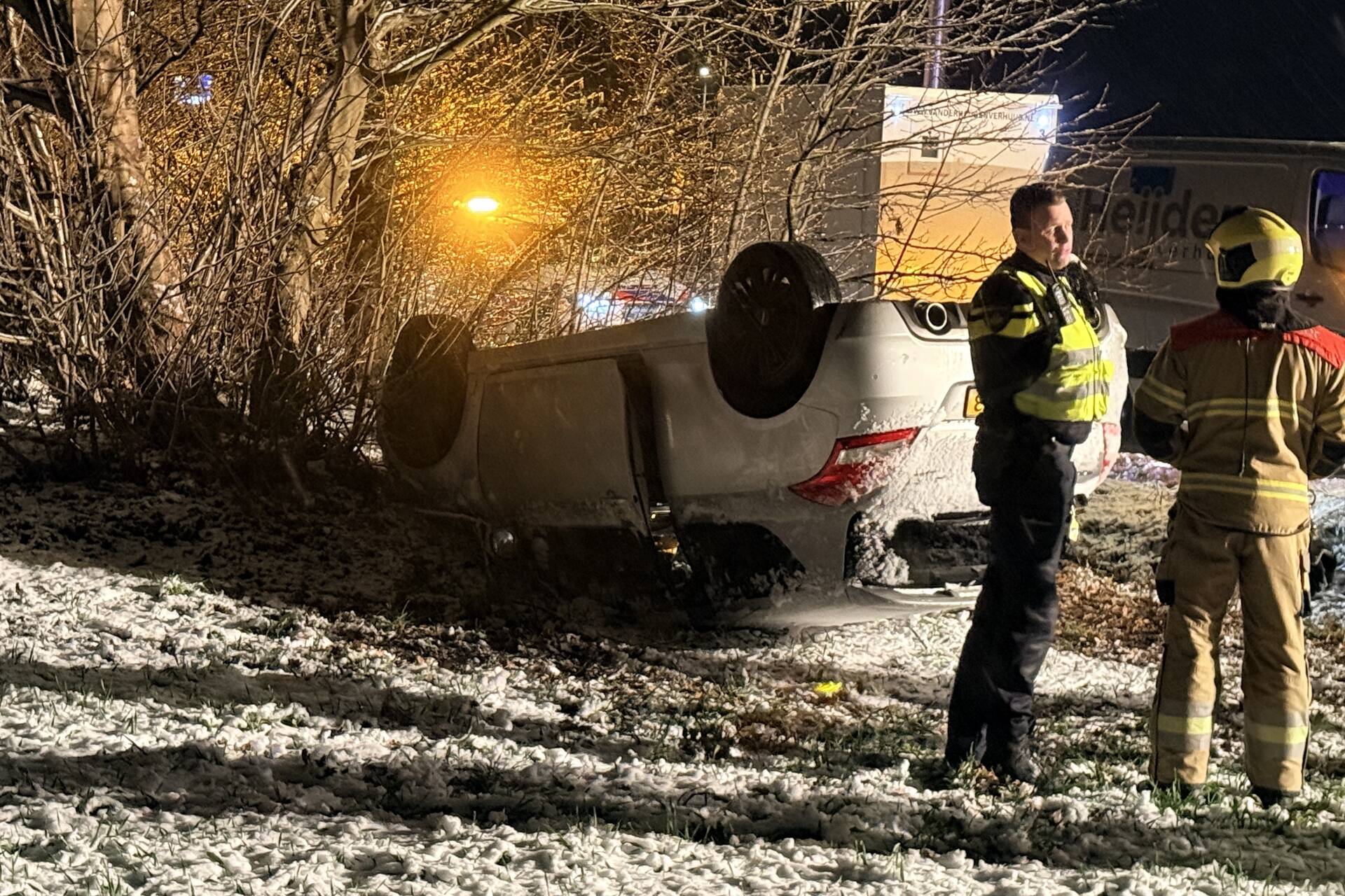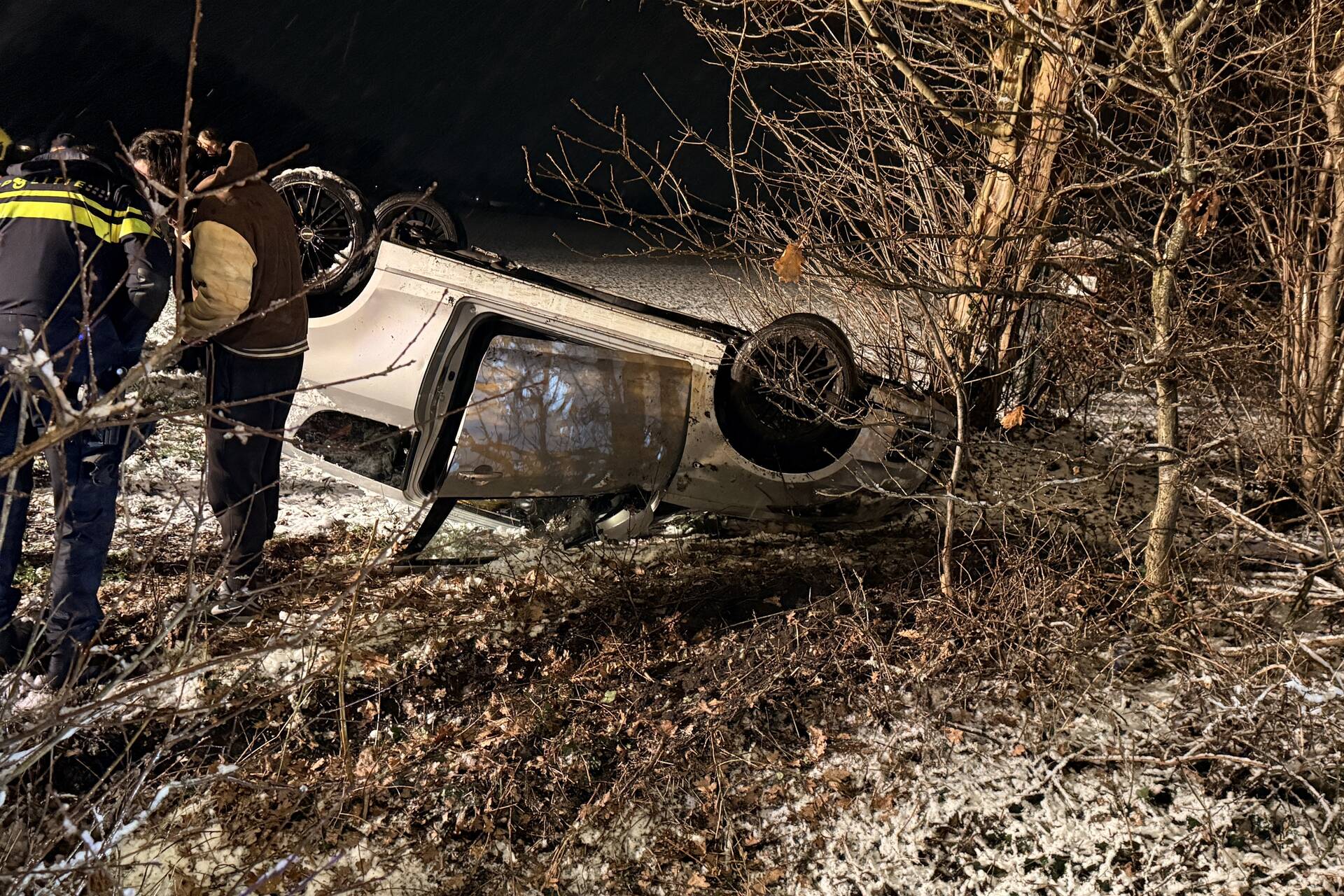 Een automobilist is mogelijk door de gladheid de macht over het stuur verloren, raakte hierdoor van de weg en belandde op de kop naast de weg. De hulpdiensten waren al snel aanwezig en richtten zich op de hulpverlening van de gewonde bestuurder.