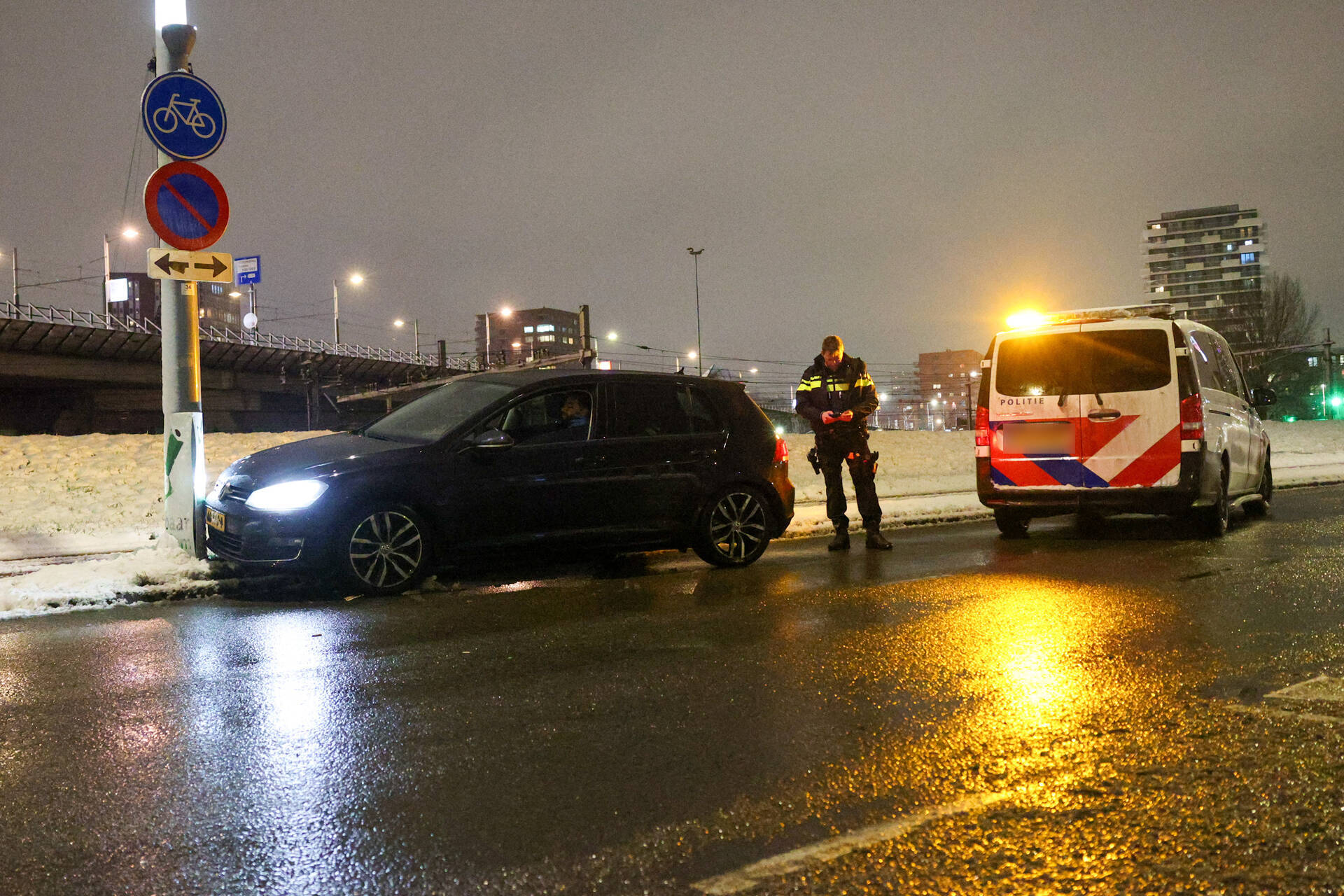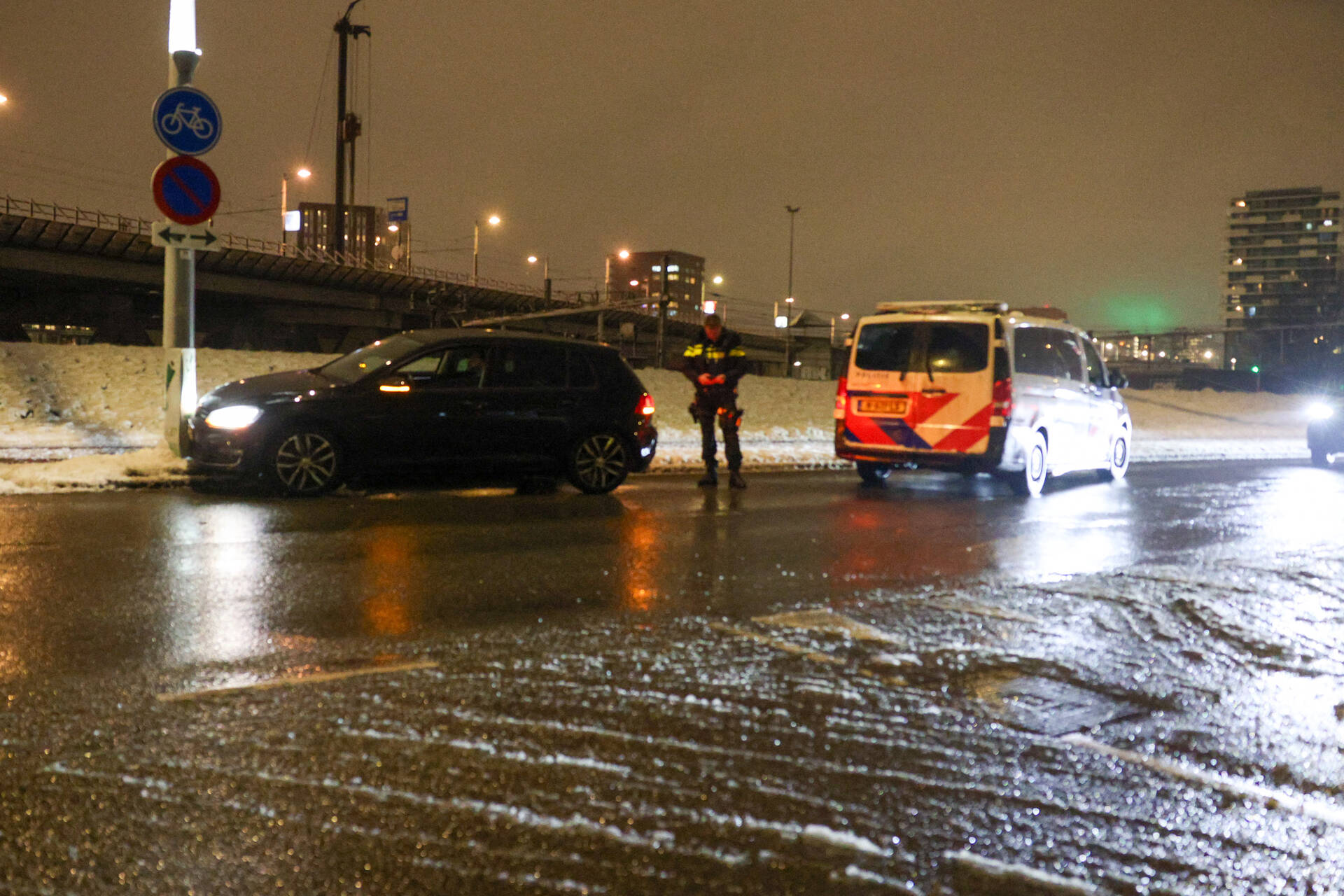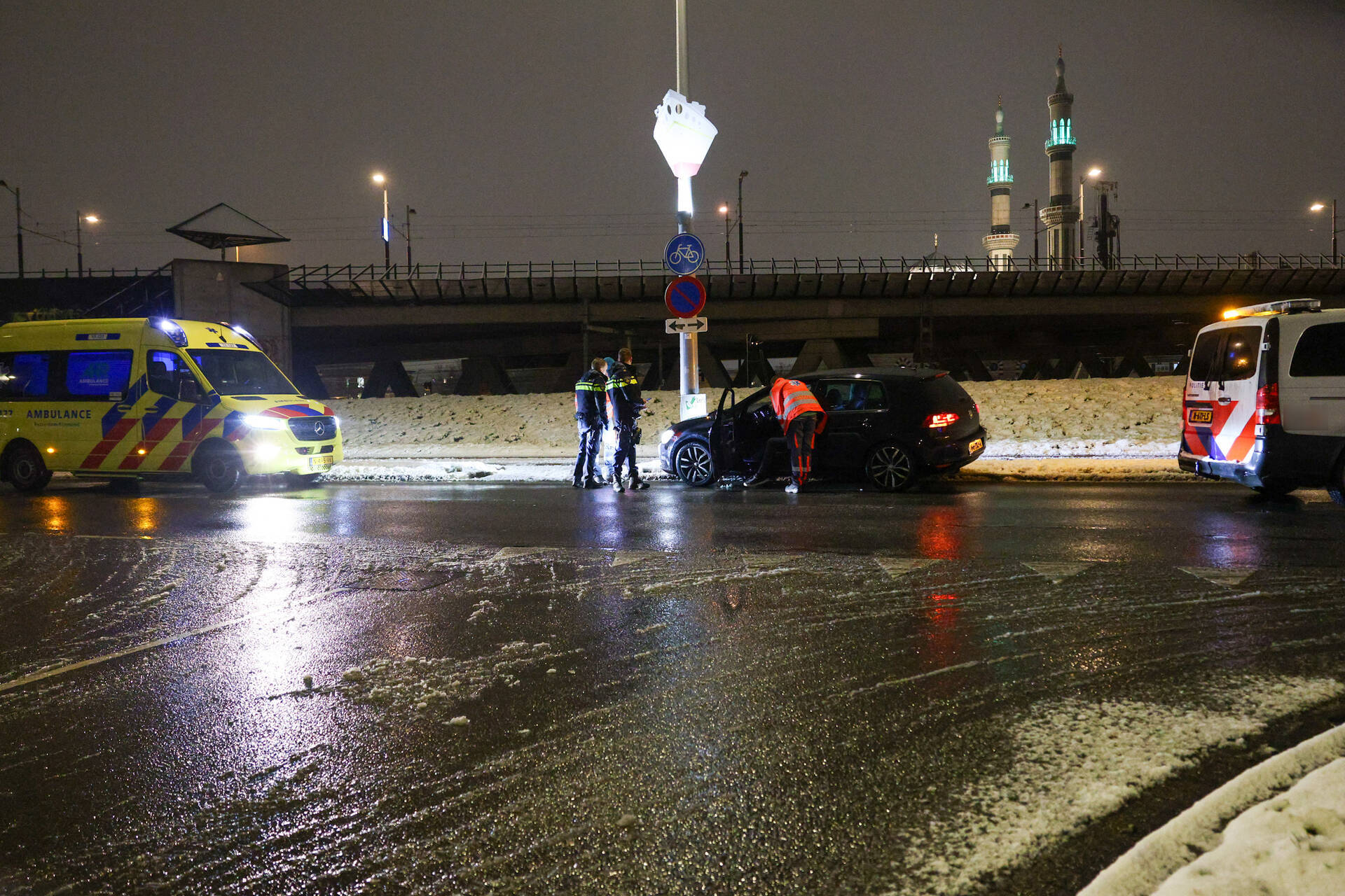 ROTTERDAM - In de late avond van zondag 15 februari niet lang voor 20.50 uur kwam het tot een ongeval aan de Korte Stadionweg in Rotterdam. Een man raakte door de gladheid van de weg en botste tegen een lantaarnpaal. Hij werd vervolgens nagekeken in de ambulance, maar hoefde niet mee naar het ziekenhuis. Het betrof een eenzijdig ongeval waarbij de nek van de man werd vastgehouden door een agent in de auto.